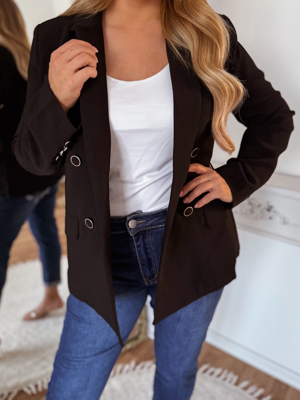 Az elegáns, díszgombeivel ellátott, fekete, hosszított fazonú blézer egy univerzális darab, amely könnyen kombinálható nadrággal és ruhával egyaránt. A finoman testhezálló szabás nőies és stílusos megjelenést kölcsönöz, míg a fehér szín frissességet és eleganciát ad az öltözéknek. A model mér 168 cm, és XL-es méretet visel.