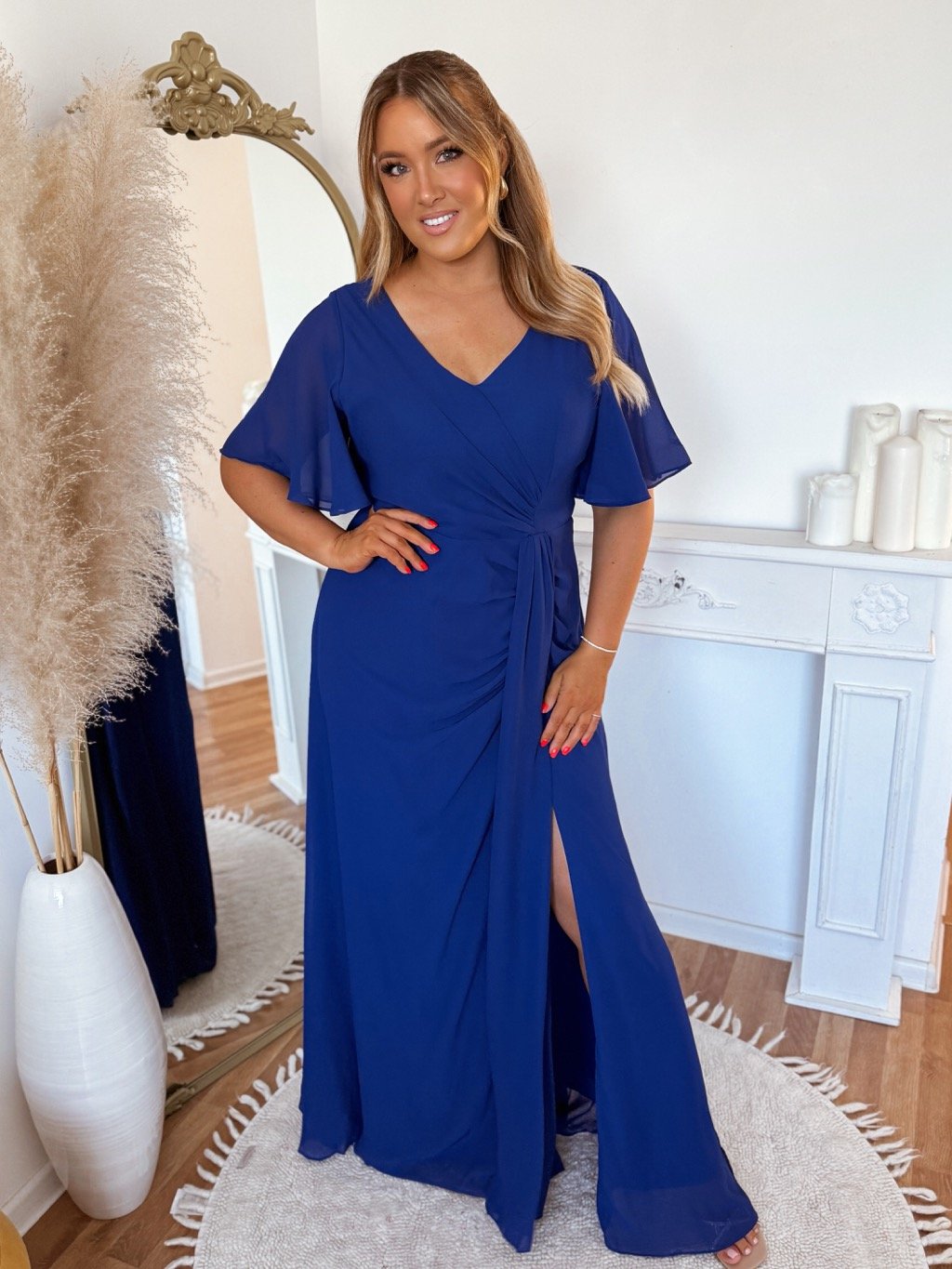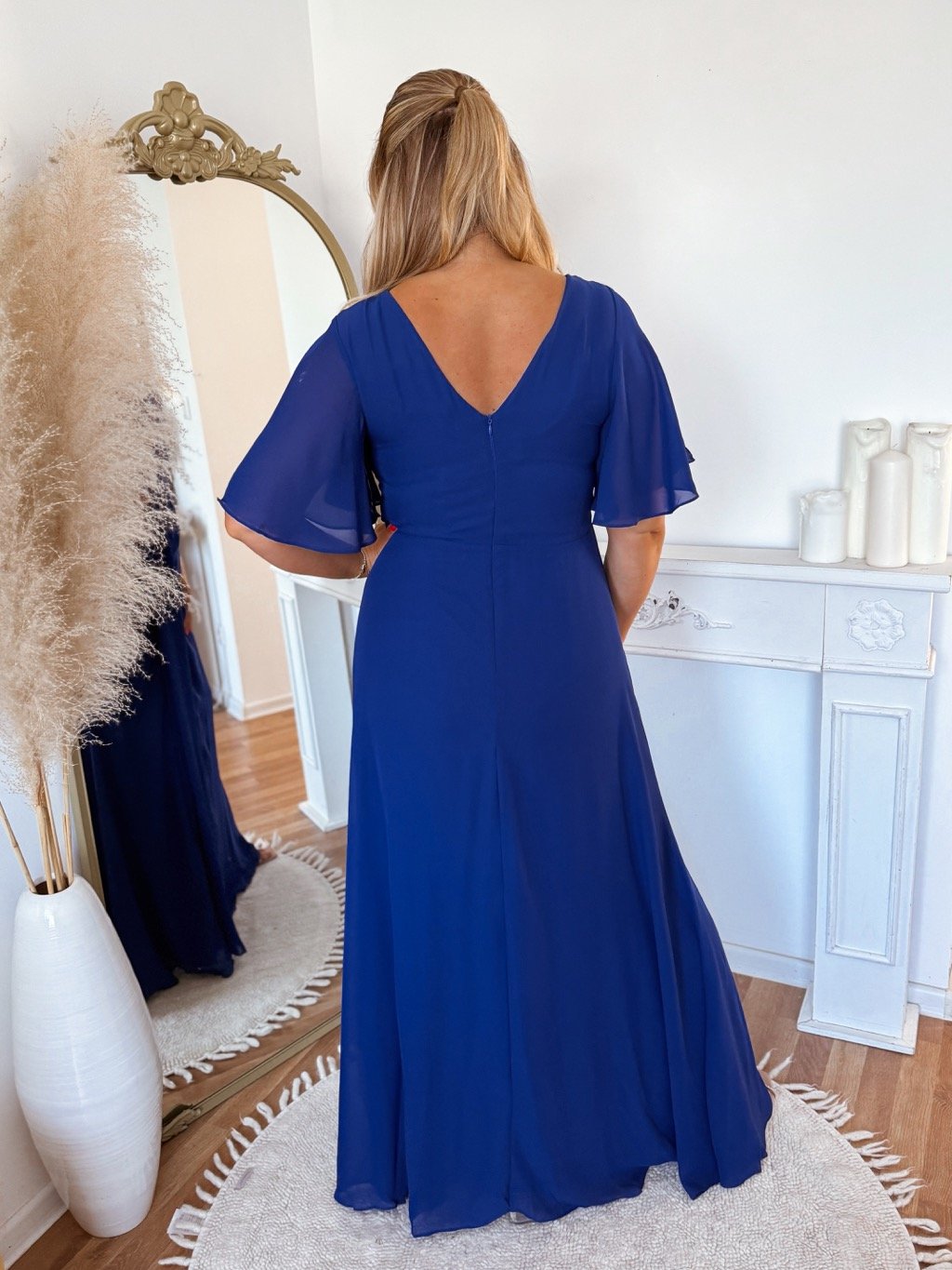 Hosszú estélyi ruha molett nőknek, rövid ujjú. A ruha hátul cipzárral záródik, mellrészen finom habszivacs merevítéssel. A model mér 168 cm, és XL-es méretet visel.