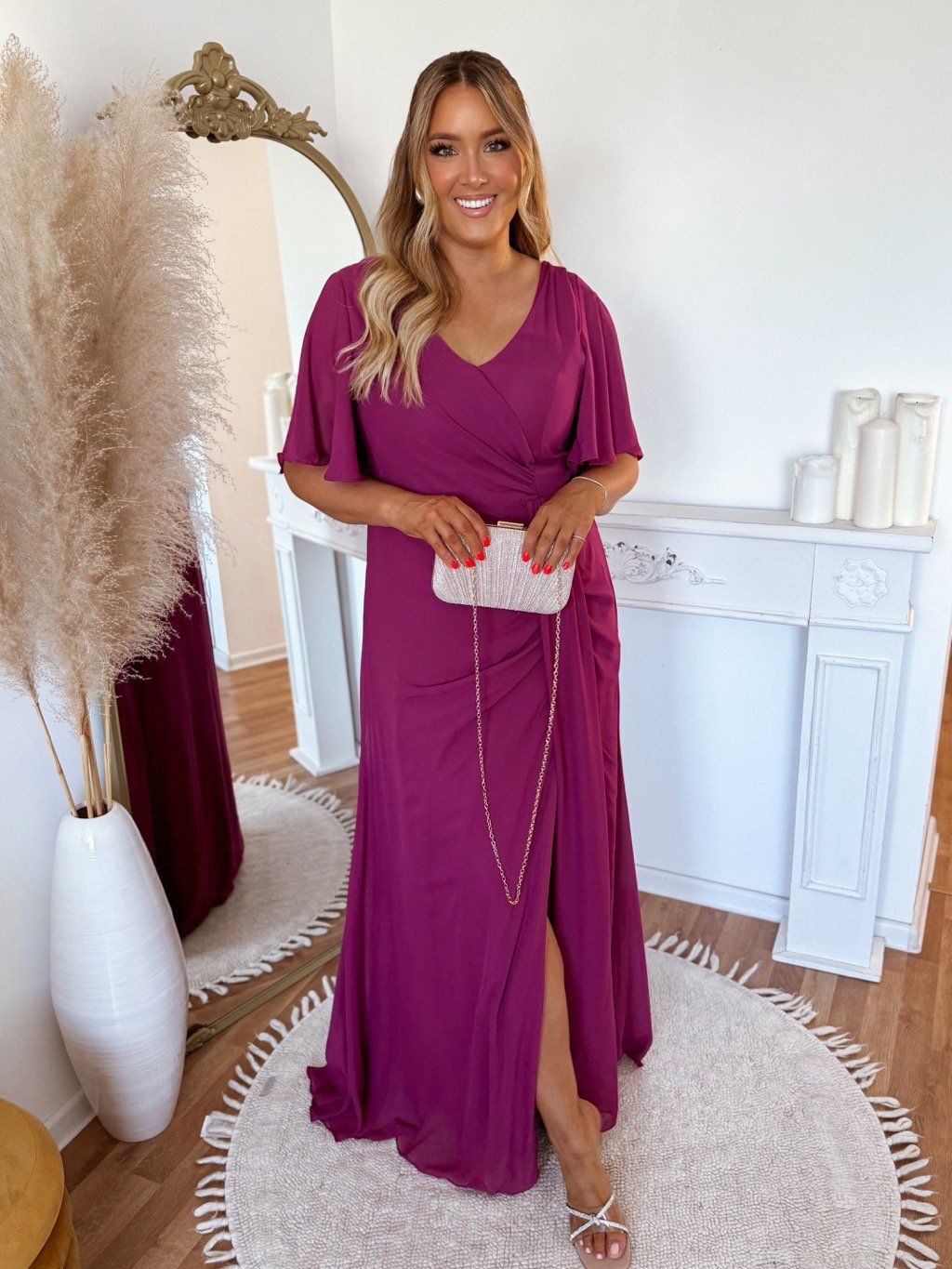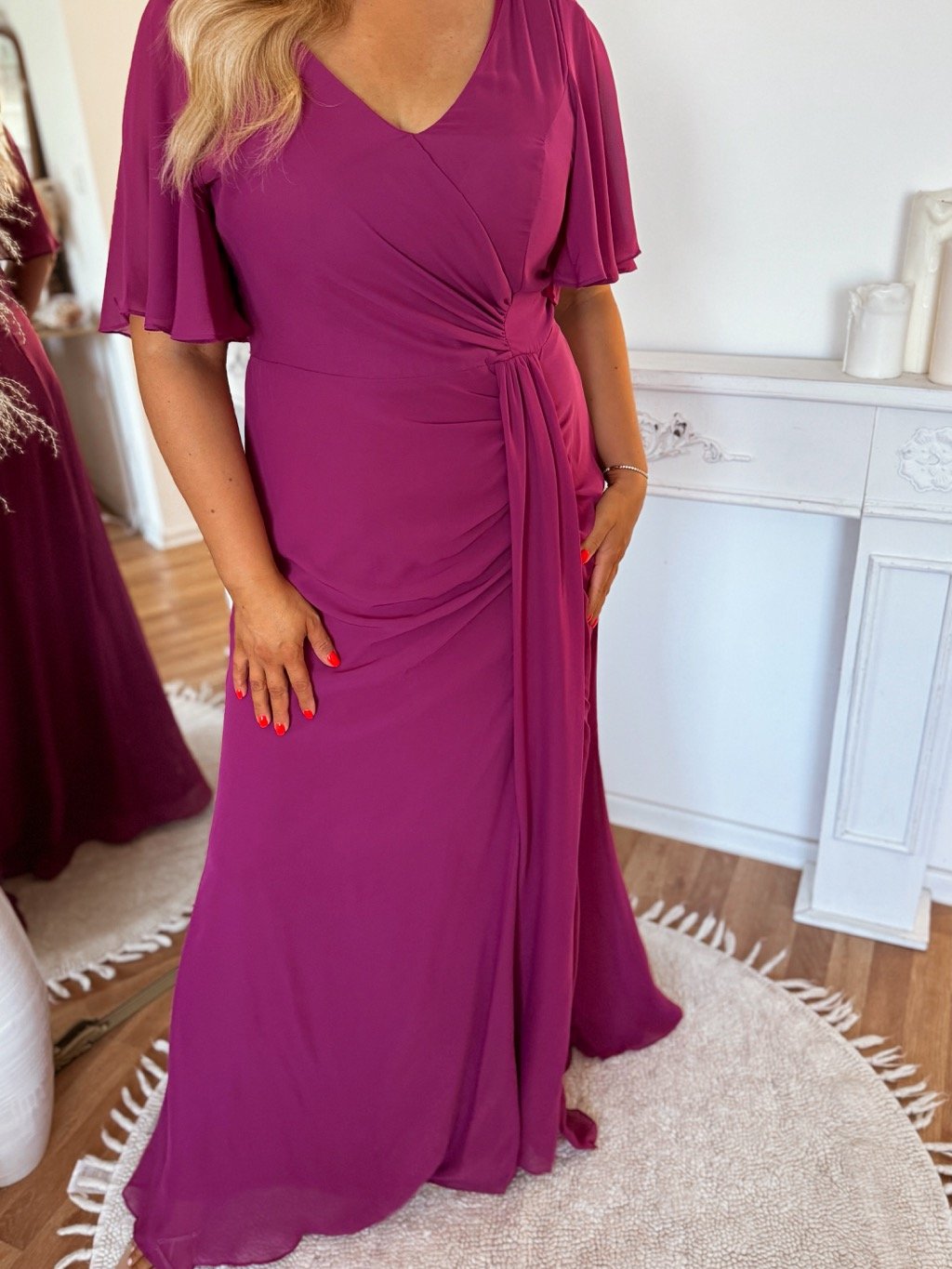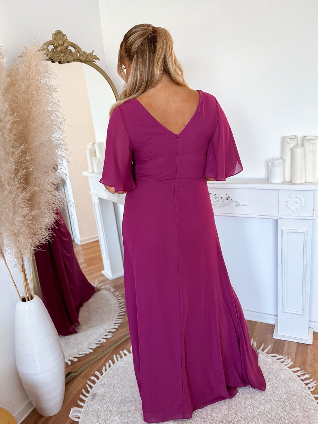 Hosszú zöld alkalmi ruha moletteknek rövid ujjal. A ruha hátul cipzárral záródik, mellrészen finom habszivacs merevítéssel. A model mér 168 cm, és XL-es méretet visel.