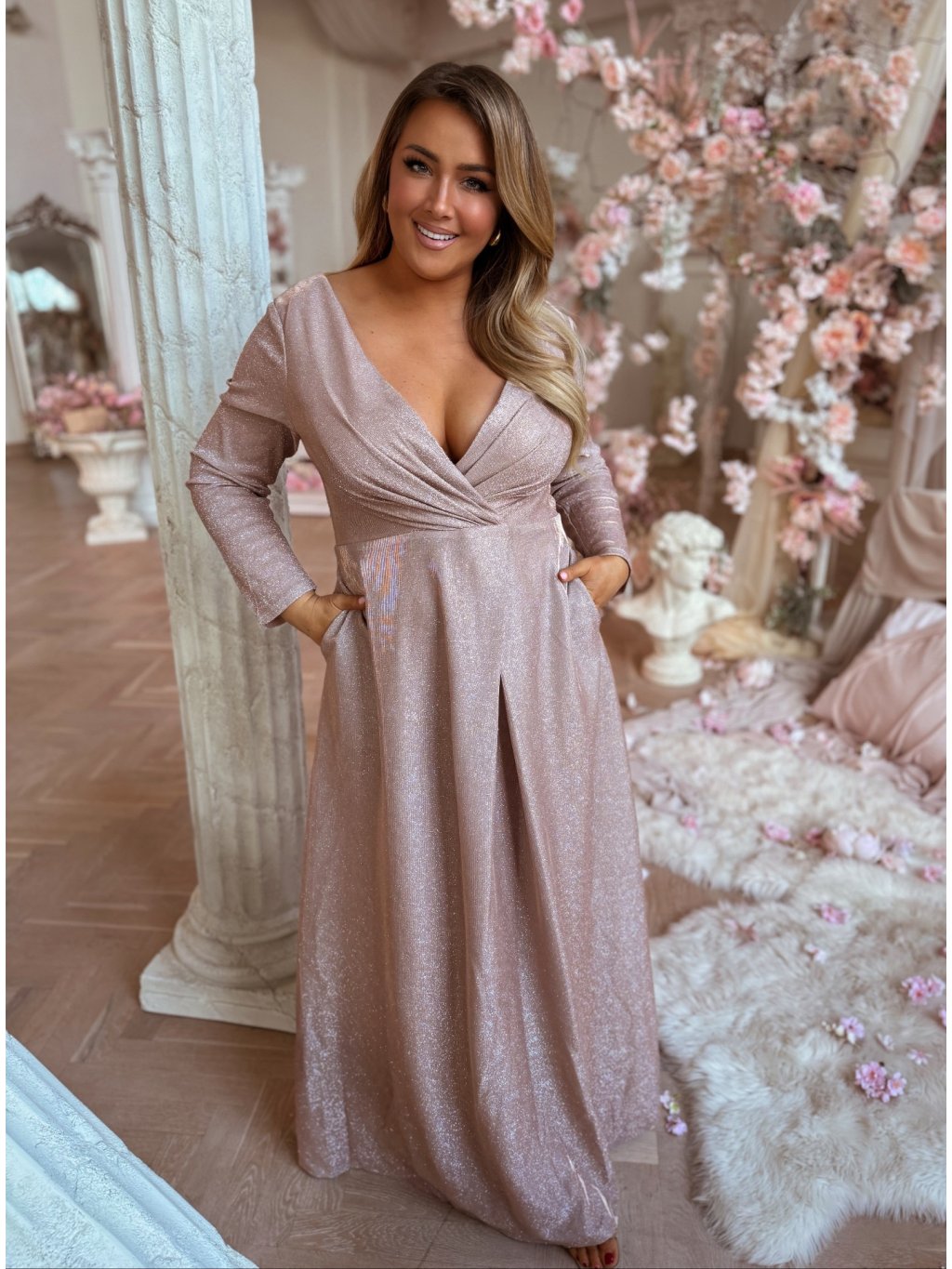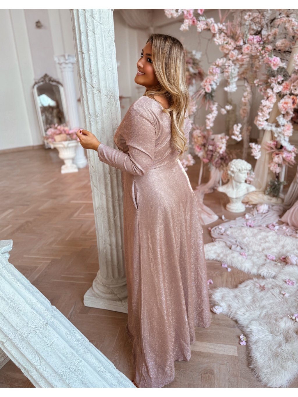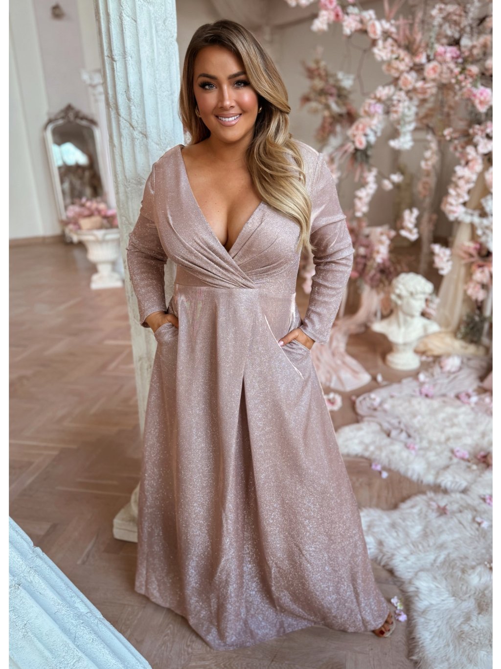 Hosszú estélyi ruha hosszú ujjakkal, bőséges szoknyával és zsebekkel. A ruha enyhén rugalmas, a szoknya teljesen laza szabású. A hátoldalon cipzáras záródás található. A model mér 168 cm, és XL-es méretet visel.