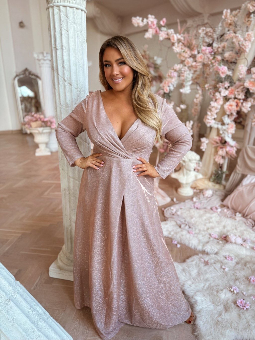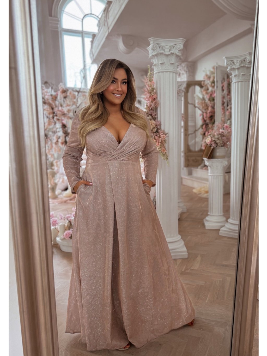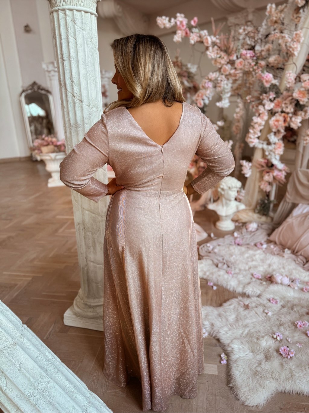 Hosszú estélyi ruha hosszú ujjakkal, bőséges szoknyával és zsebekkel. A ruha enyhén rugalmas, a szoknya teljesen laza szabású. A hátoldalon cipzáras záródás található. A model mér 168 cm, és XL-es méretet visel.