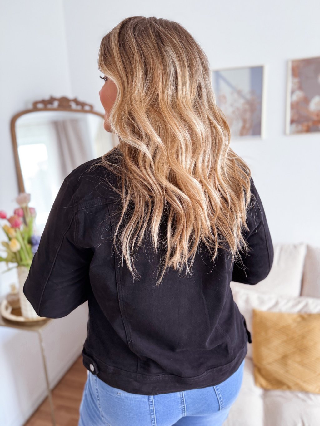 Rövid fekete farmerdzseki zsebekkel, a dzseki rugalmas. A modell 168 cm magas és 42-es méretet visel.