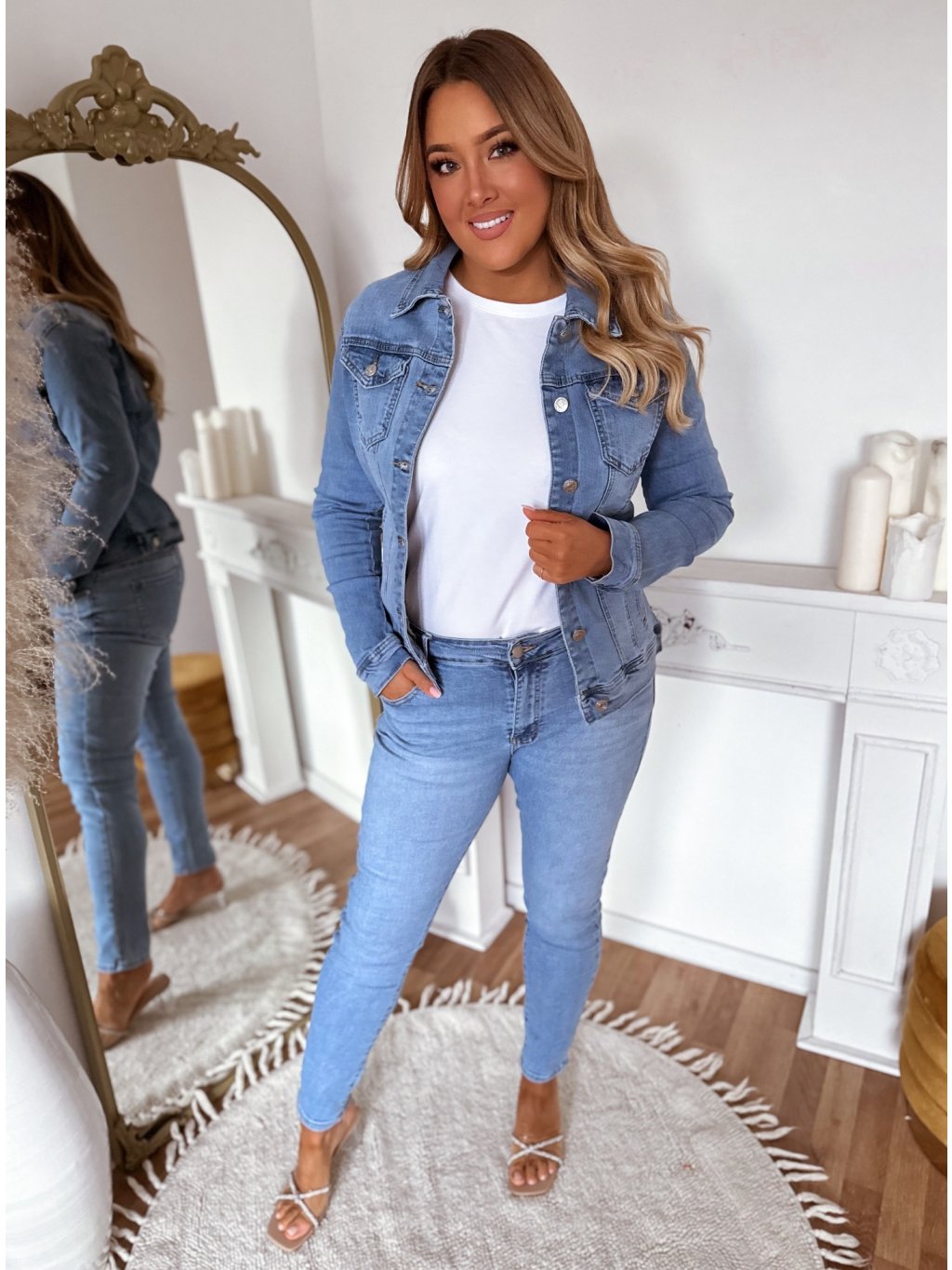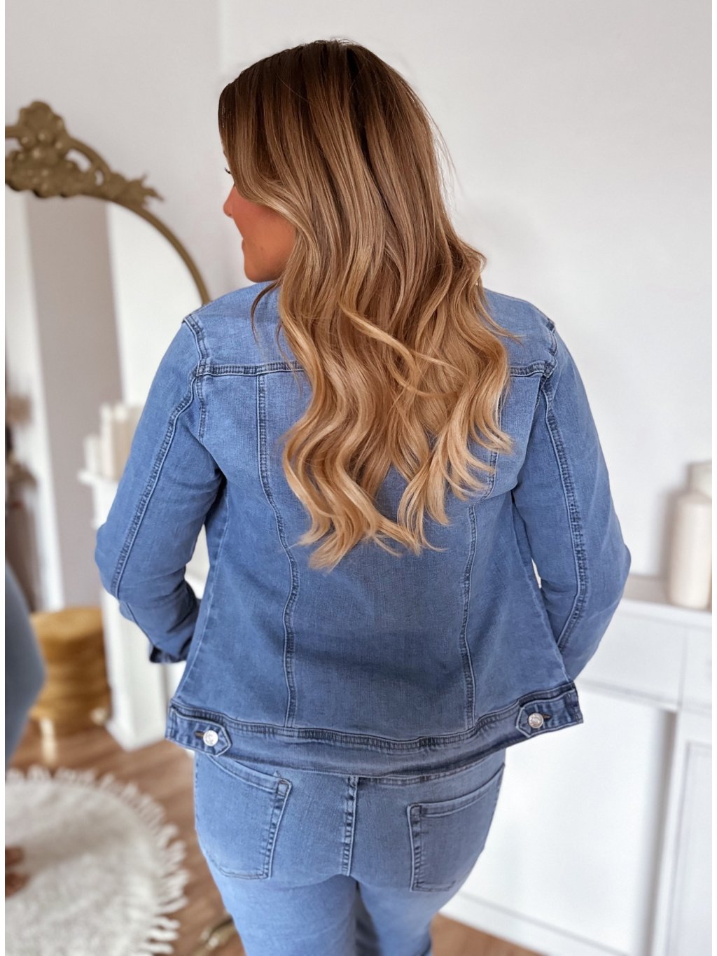 Rövid kék farmerdzseki zsebekkel, a dzseki enyhén rugalmas. A modell 168 cm magas és 42-es méretet visel.