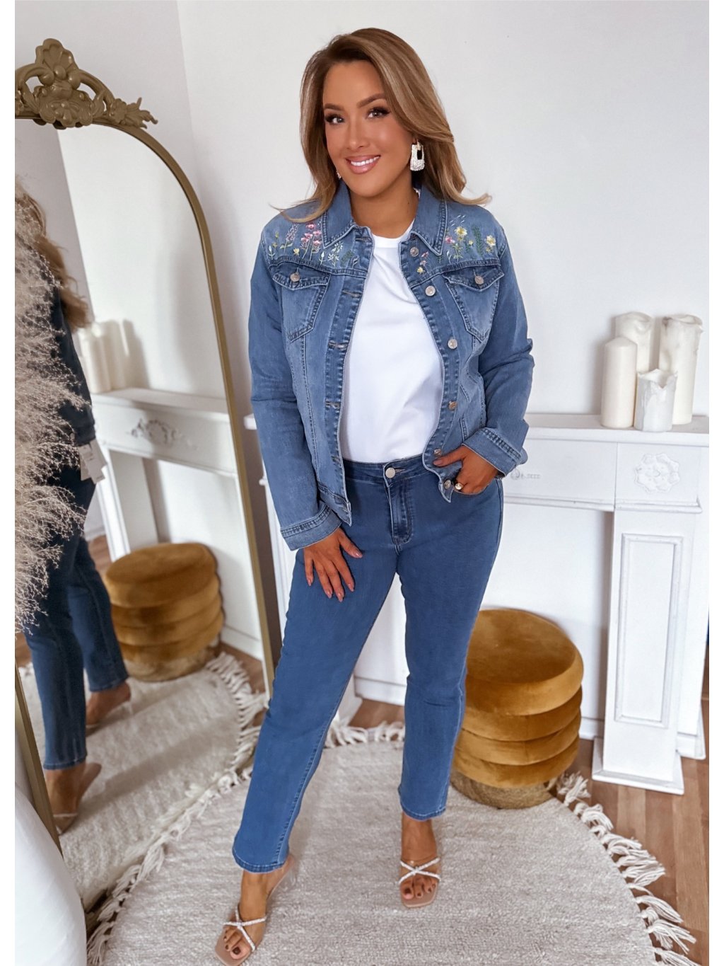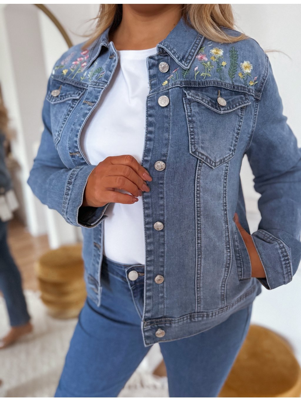 Rövid kék farmerdzseki zsebekkel és virágos hímzéssel, a dzseki enyhén rugalmas. A modell 168 cm magas és 42-es méretet visel.