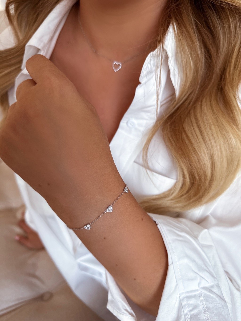Női karkötő finom cirkónia szívvel romantikusnak és elegánsnak tűnik. Univerzális kialakításának köszönhetően ideális kiegészítő mindennapi viseletre és különleges alkalmakra, és gyönyörűen párosítható az azonos stílusú nyaklánccal.