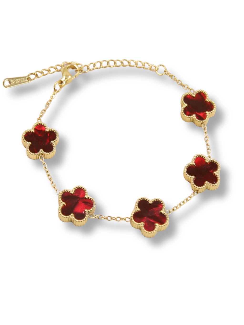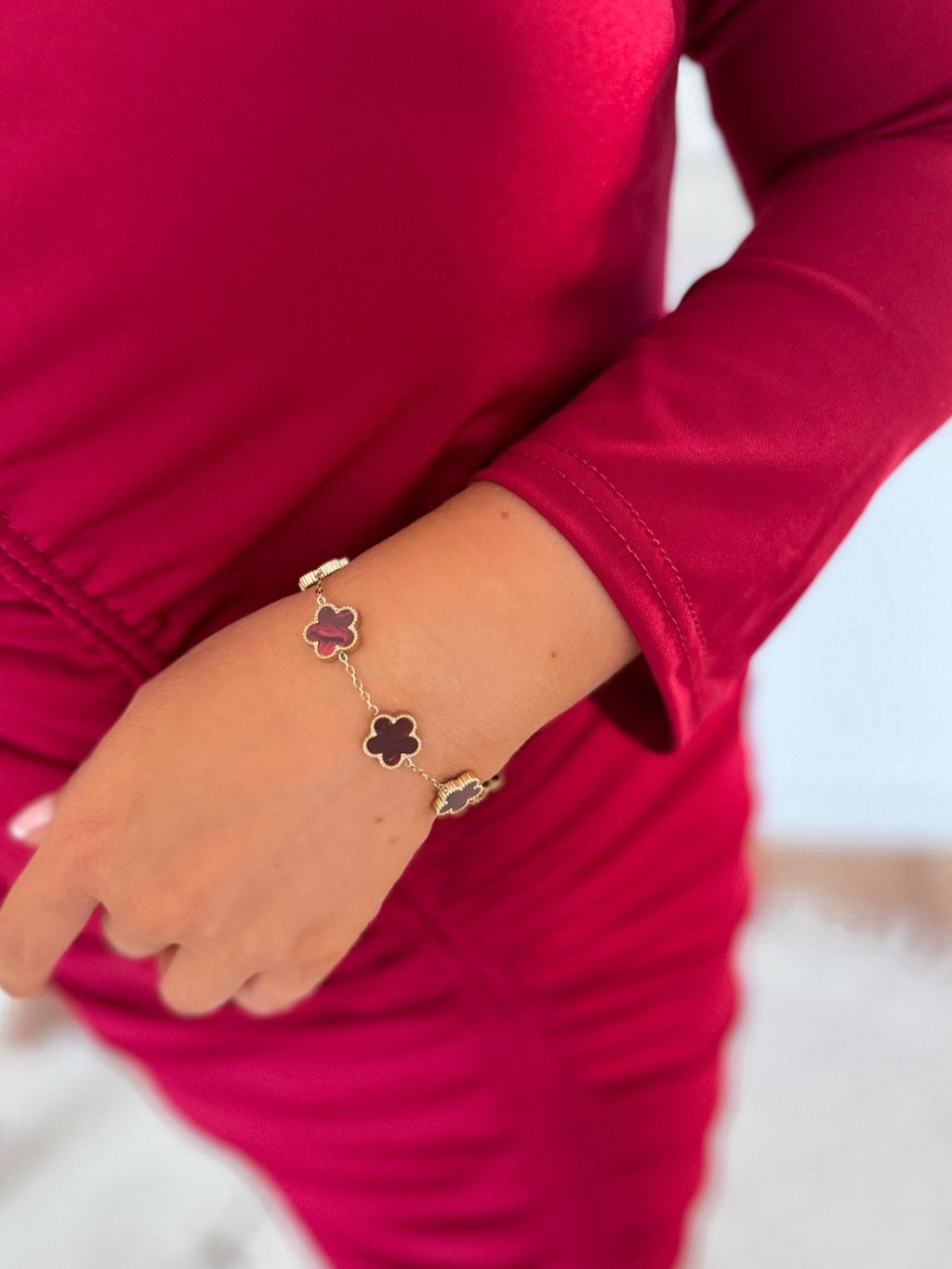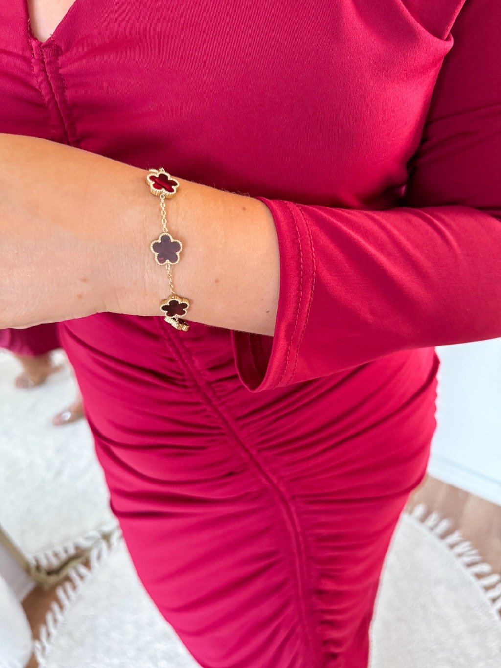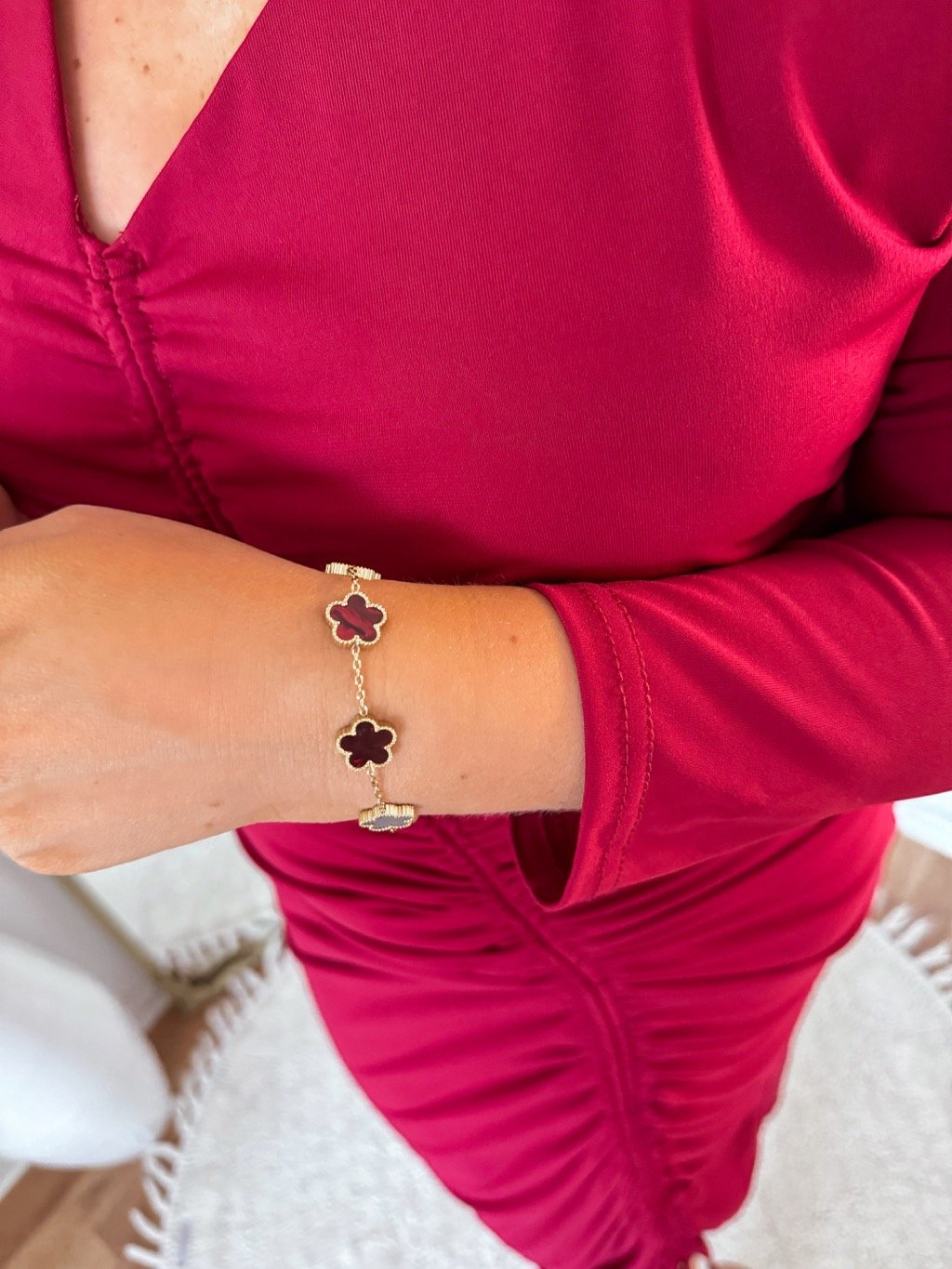 Női karkötő bordó virágokkal elegáns és feldobja minden ruhát. Az állítható hosszúságának köszönhetően kényelmesen illeszkedik a csuklóra, és ideális kiegészítő különleges alkalmakra és mindennapi viseletre egyaránt.