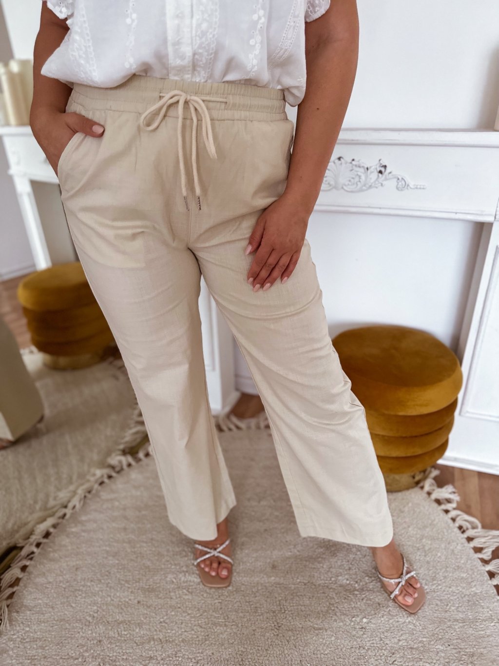 Könnyű nyári nadrág derékban gumival, bővülő szárral és zsebekkel. A modell 168 cm magas és 44-es méretet visel.