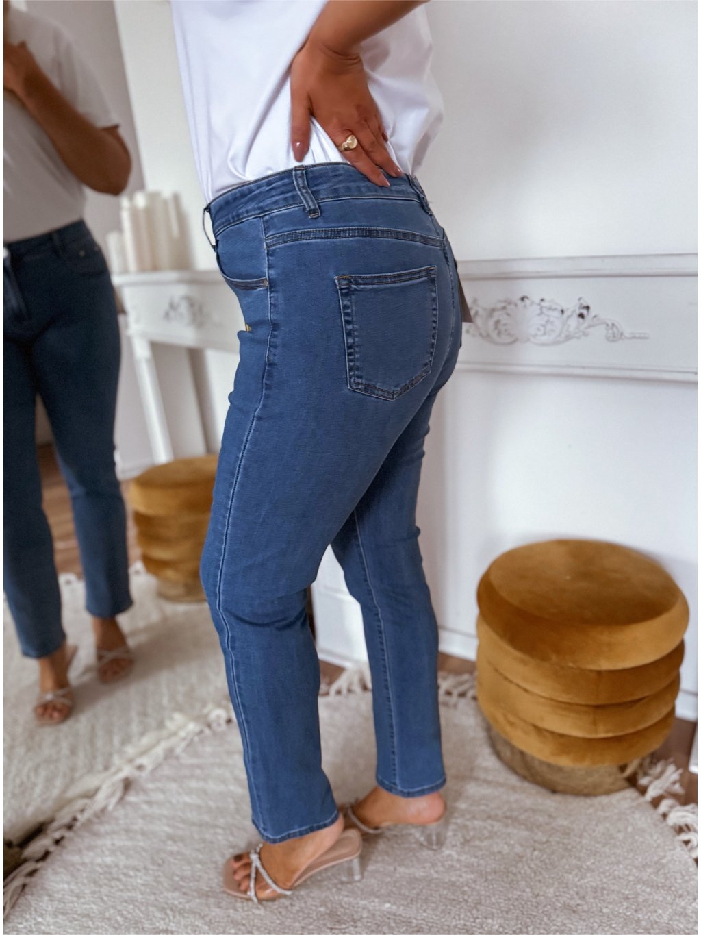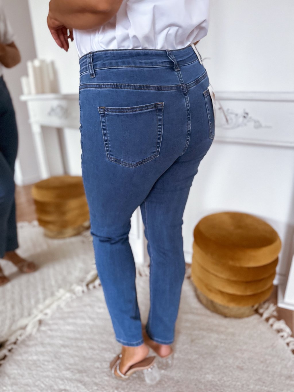 Elasztikus farmer, zsebekkel és magas derékkal. A nadrág alkalmazkodik az alakhoz. A modell 168 cm magas és 42-es méretet visel.