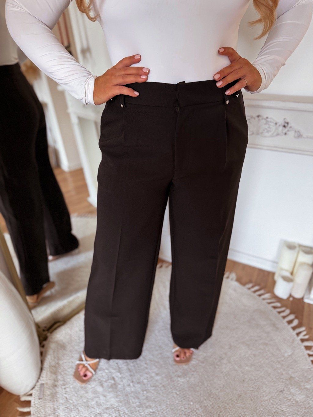 Elegáns, magas derekú, zsebes nadrág, elöl cipzárral. A model mér 168 cm, és XL-es méretet visel.