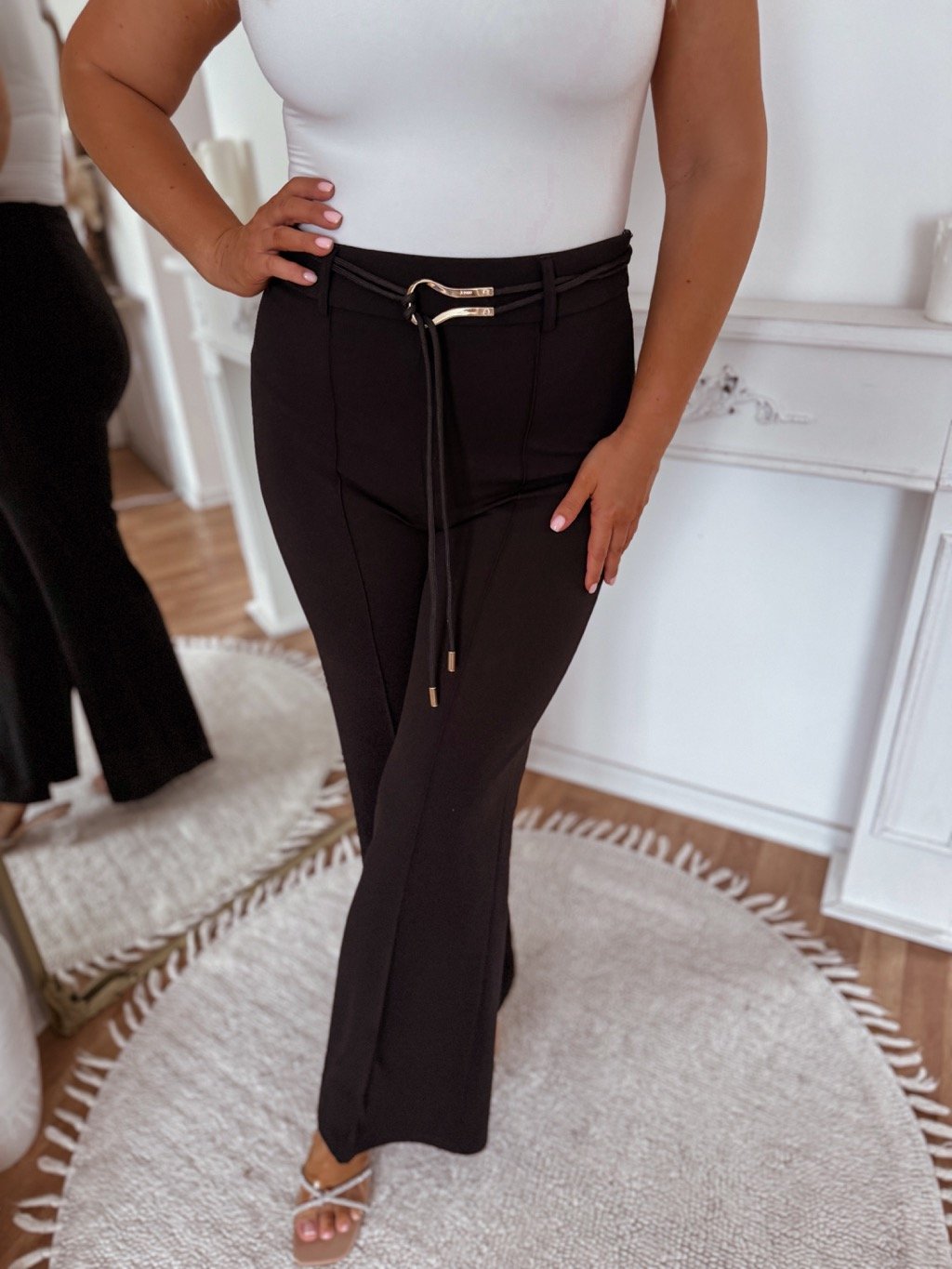 Elegáns nadrág elasztikus, oldalsó cipzárral. A nadrág felső része keskenyebb, lefelé pedig bővül. A nadrághoz egy arany csatos öv is tartozik. A model mér 168 cm, és XL-es méretet visel.