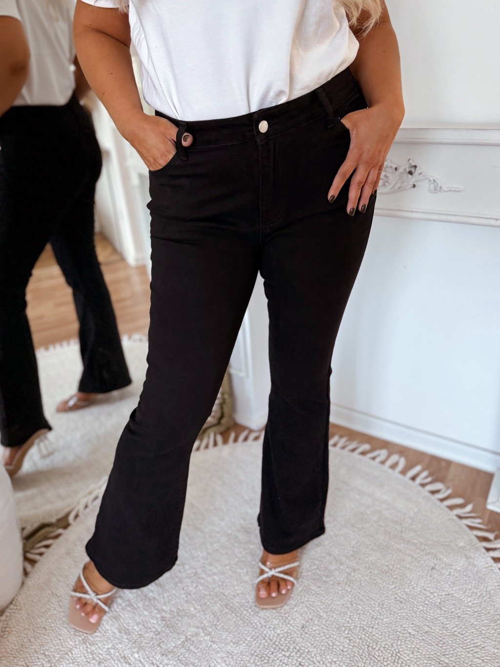 Elasztikus farmer, zsebekkel és magas derékkal. A nadrág alkalmazkodik az alakhoz. A modell 168 cm magas és 44-es méretet visel.