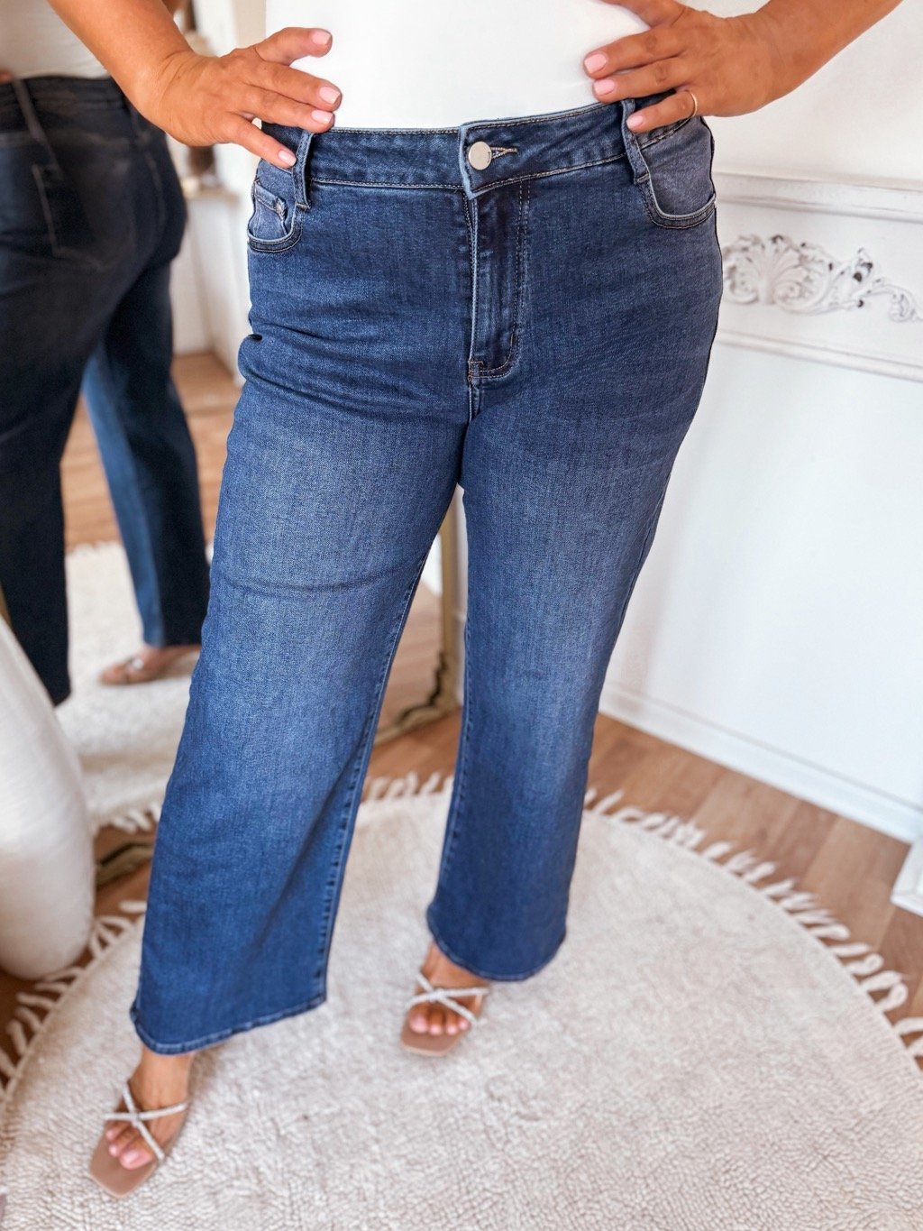 Kék, magas derekú, bő szárú farmernadrág