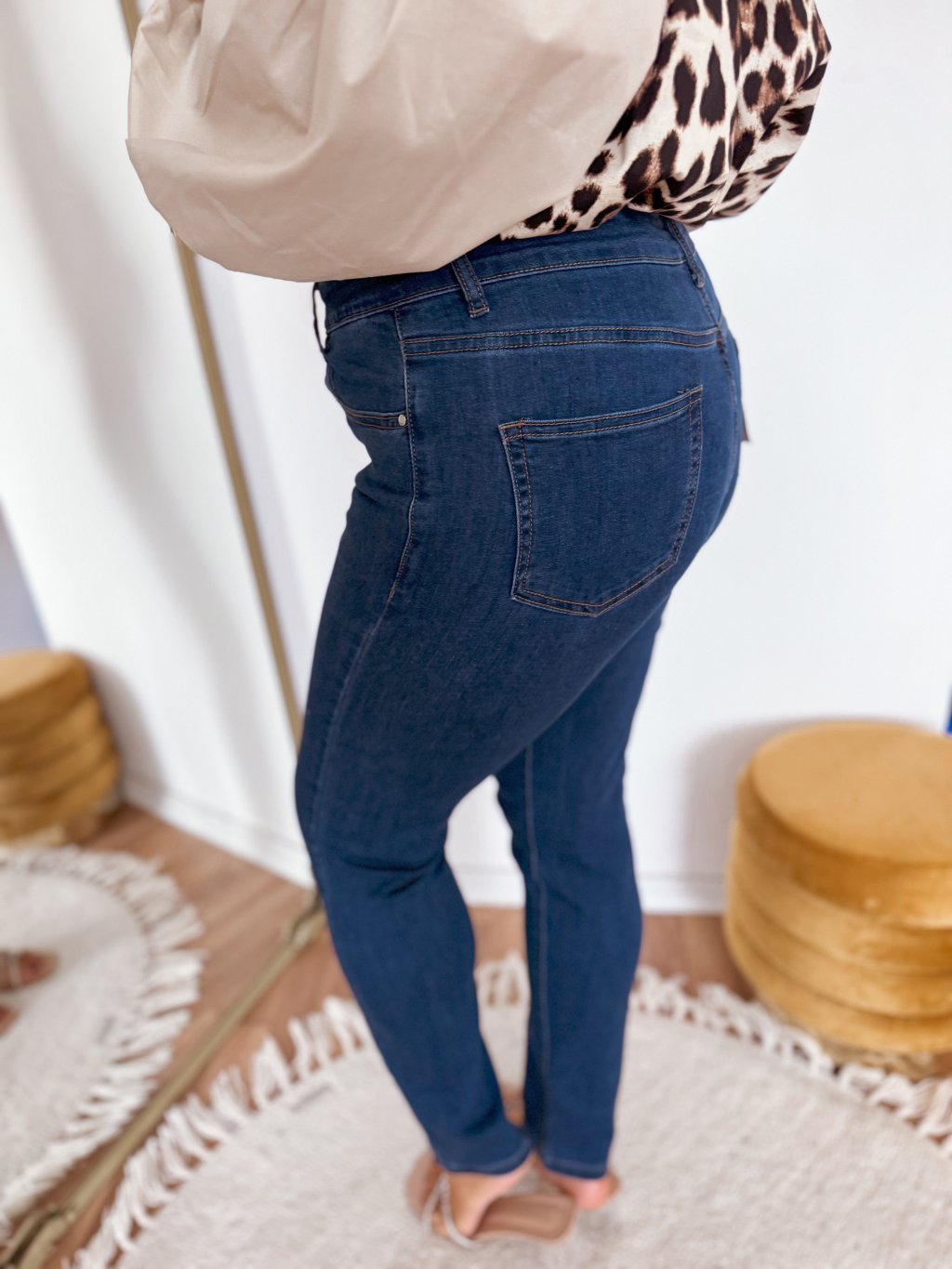 Elasztikus farmer, zsebekkel és magas derékkal. A nadrág alkalmazkodik az alakhoz. A modell 168 cm magas és 44-es méretet visel.