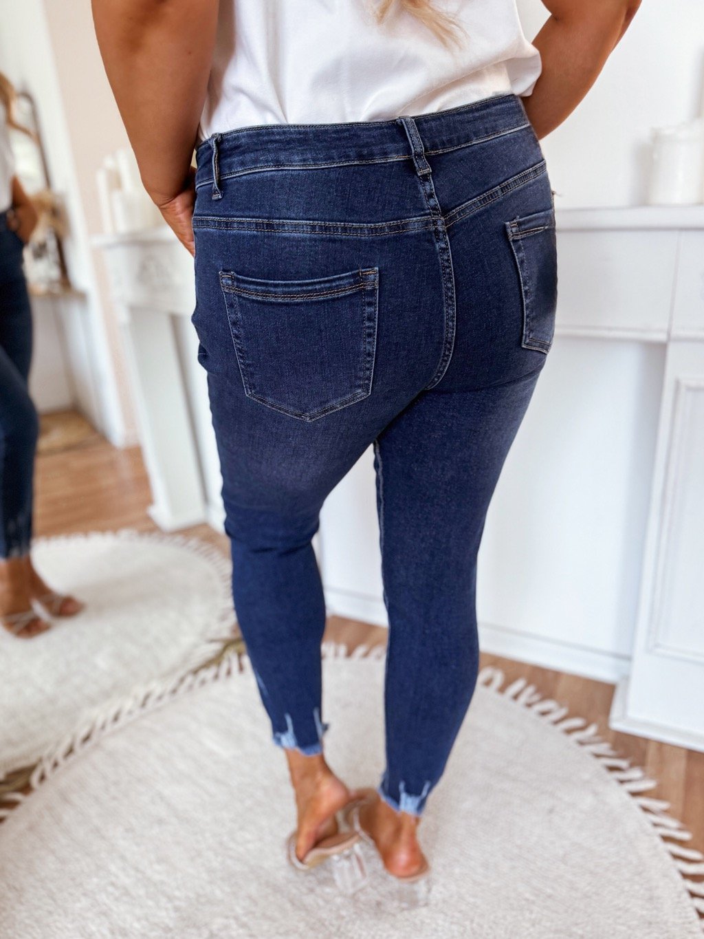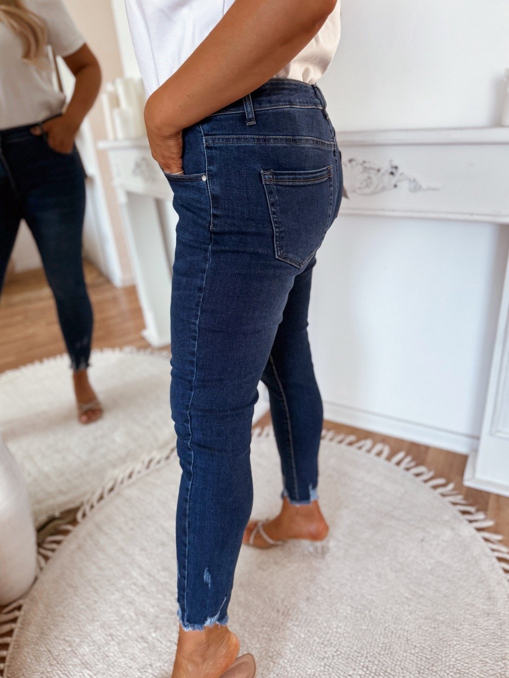 Kék, magas derekú és szűk szárú farmernadrág moletteknek, rugalmas farmeranyagból készült, amely alkalmazkodik az alakhoz és egész napos kényelmet biztosít. Az univerzális szabás könnyen kombinálható elegáns felsővel és alkalmi pólóval. A modell 168 cm magas és 44-es méretet visel.