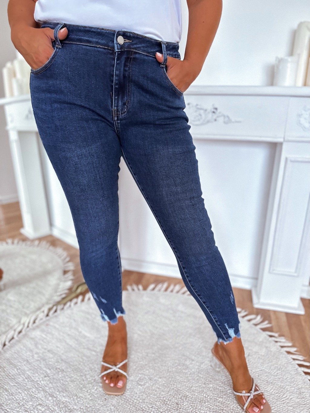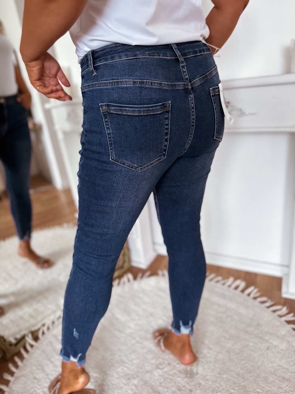 Divatos, sötétkék, magas derekú női testhezálló farmernadrág, amely gyönyörűen formálja az alakot és optikailag hosszabbítja a lábakat. A nadrágszár alján található stílusos, csonka szegély eredeti és divatos megjelenést kölcsönöz a farmernek. Az elasztikus anyagnak köszönhetően kényelmesek a mindennapi viselethez, és könnyen kombinálhatók elegáns blúzzal, trikóval vagy blézerrel. Ideális választás a hétköznapokra, munkába és szabadidős tevékenységekre egyaránt. A modell 168 cm magas és 44-es méretet visel.