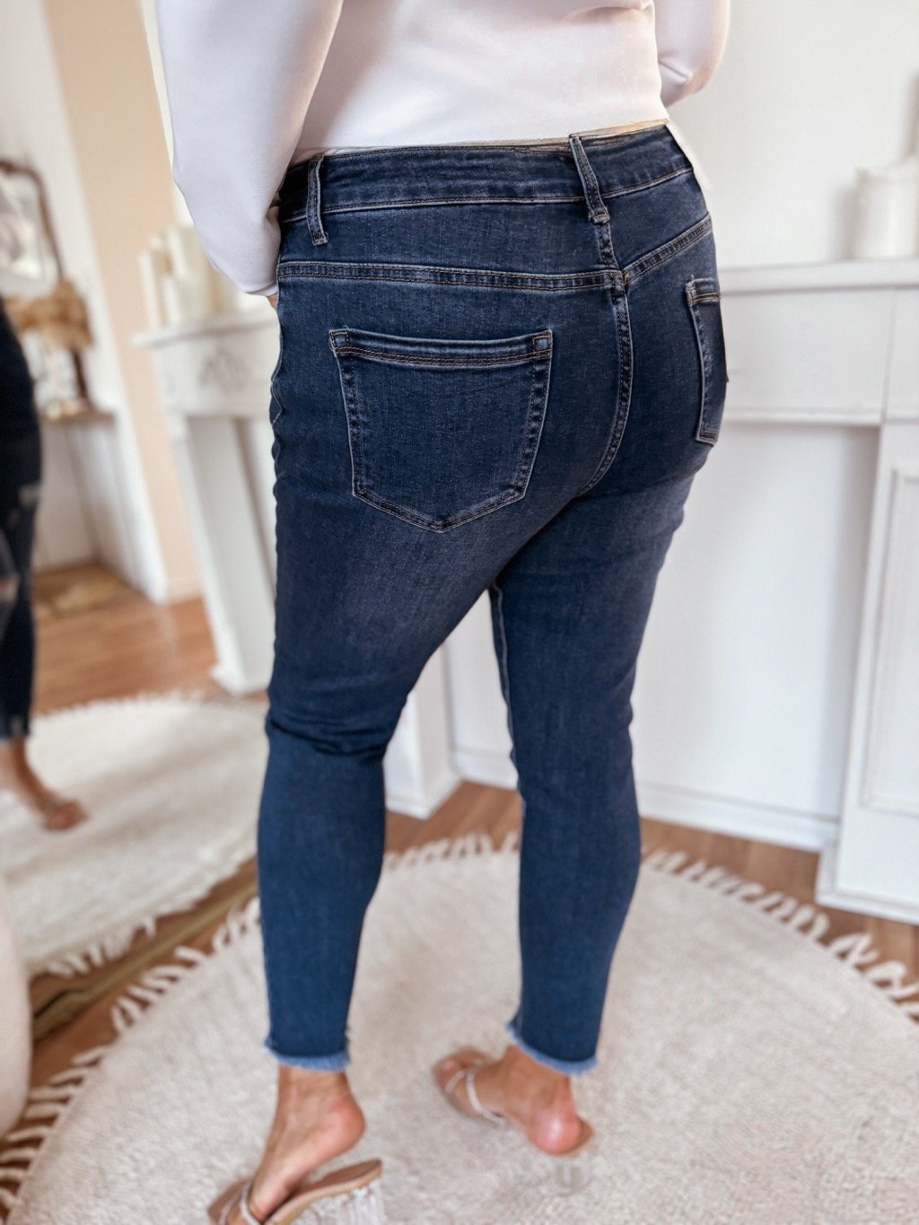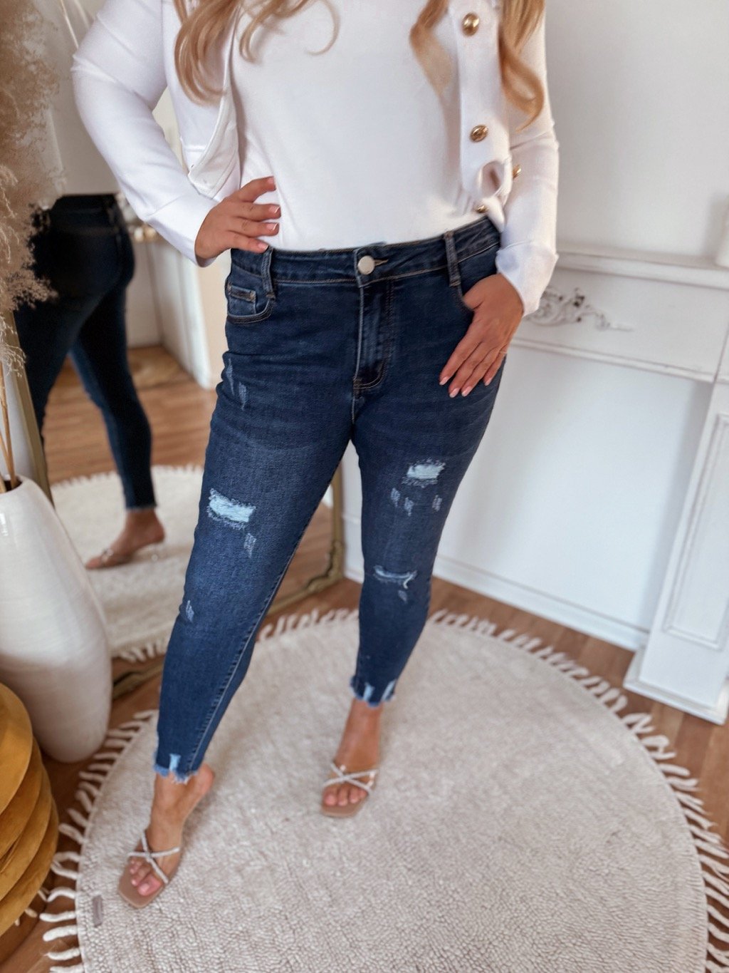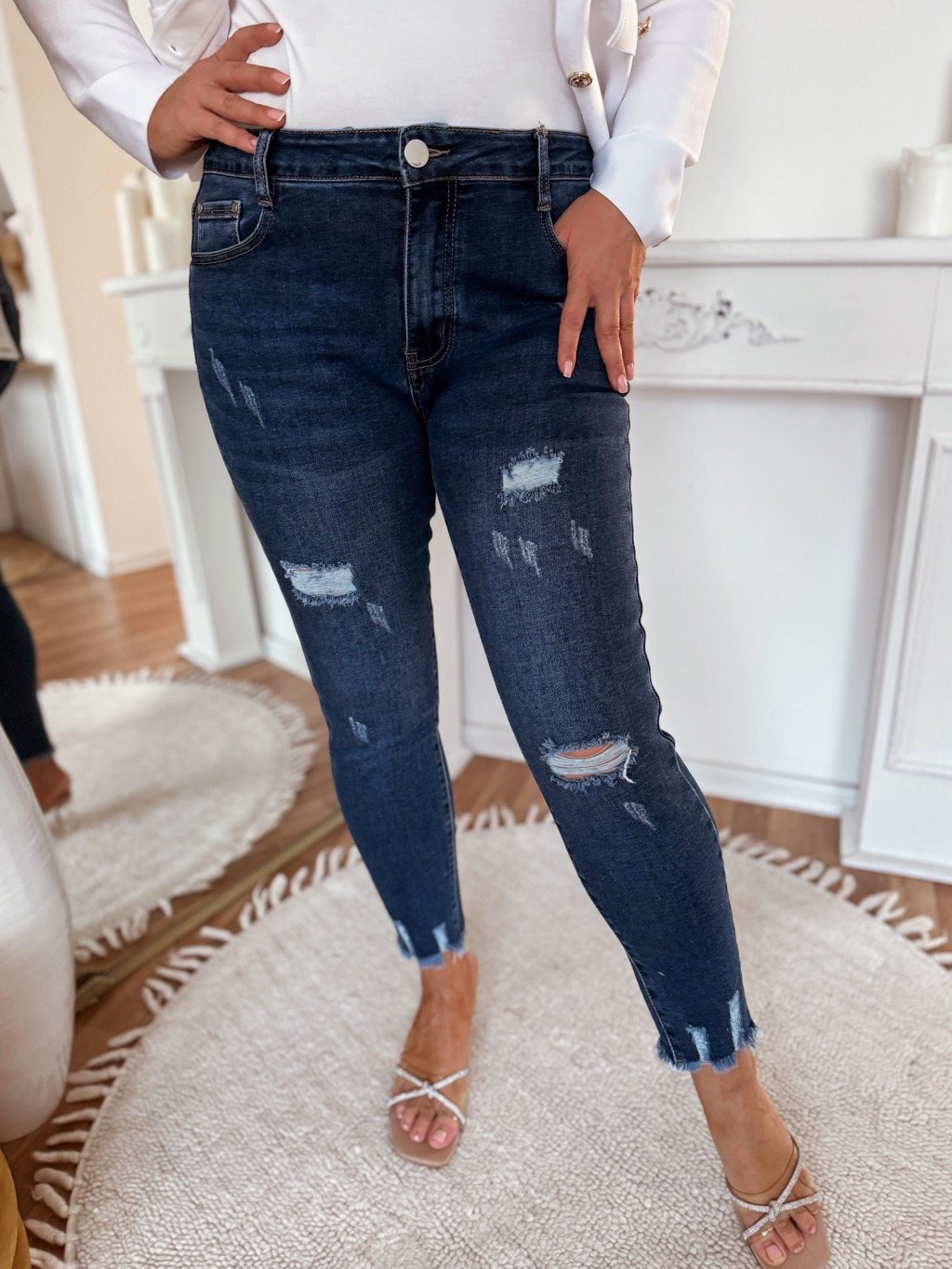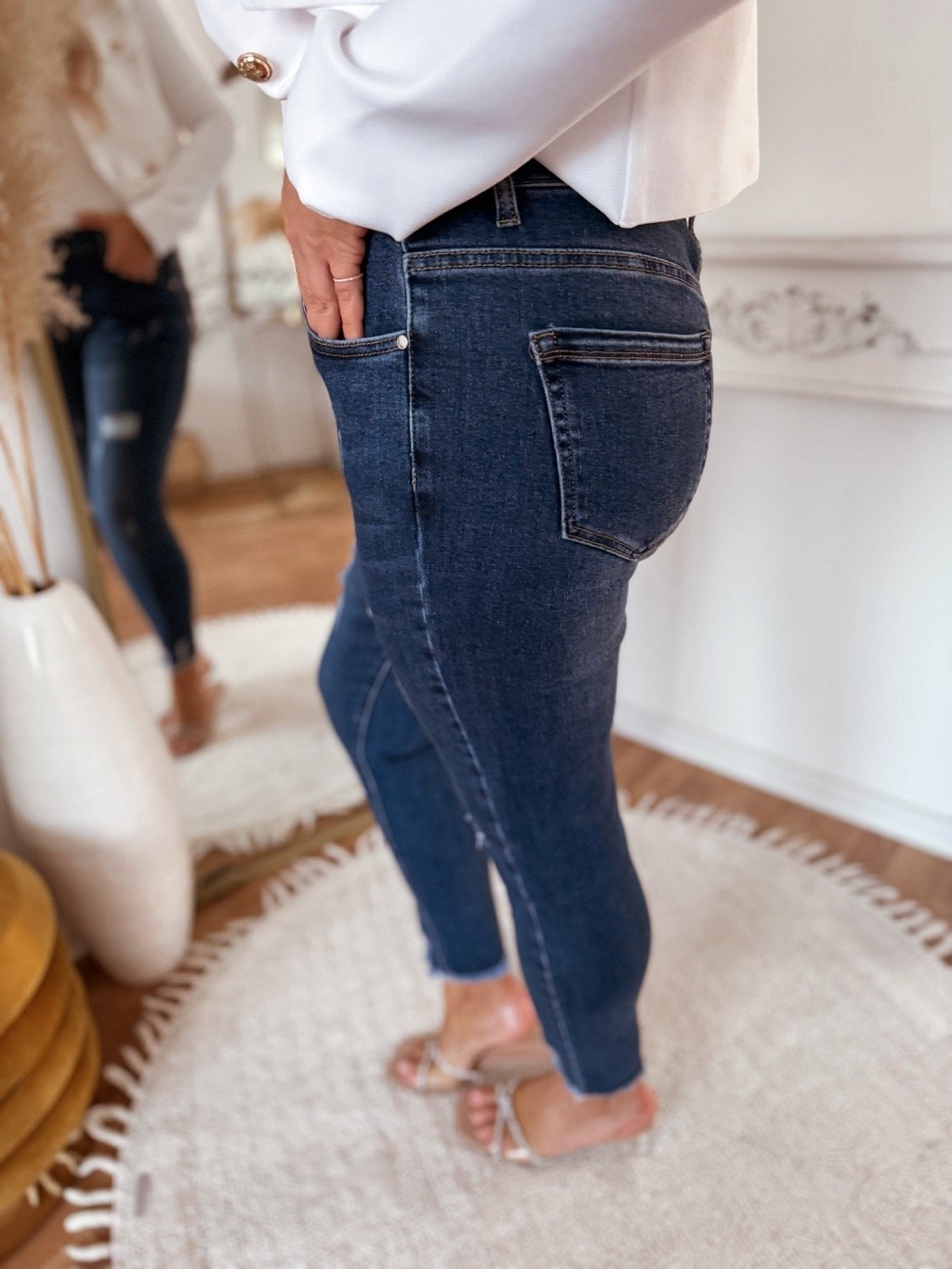 Sötétkék, magas derekú skinny farmer, amely gyönyörűen kiemeli az alakot. A kényelmes, rugalmas anyag és a finom kopott részletek modern megjelenést kölcsönöznek a mindennapokra. A modell 168 cm magas és 44-es méretet visel.