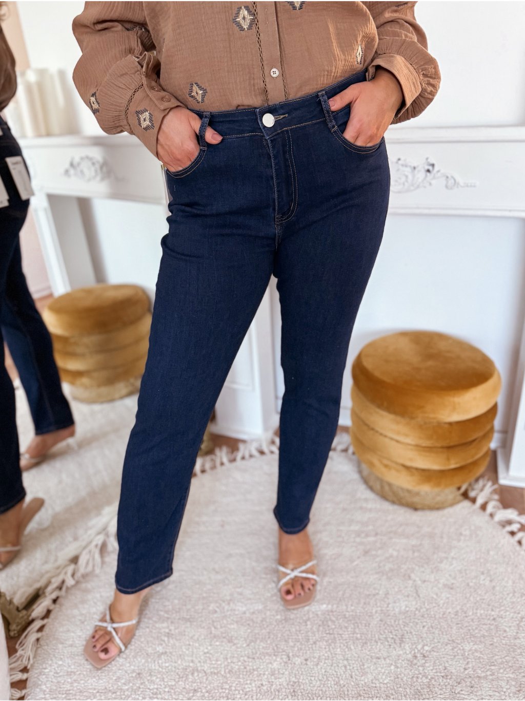 Elasztikus farmer, zsebekkel és magas derékkal. A nadrág alkalmazkodik az alakhoz. A modell 168 cm magas és 42-es méretet visel.
