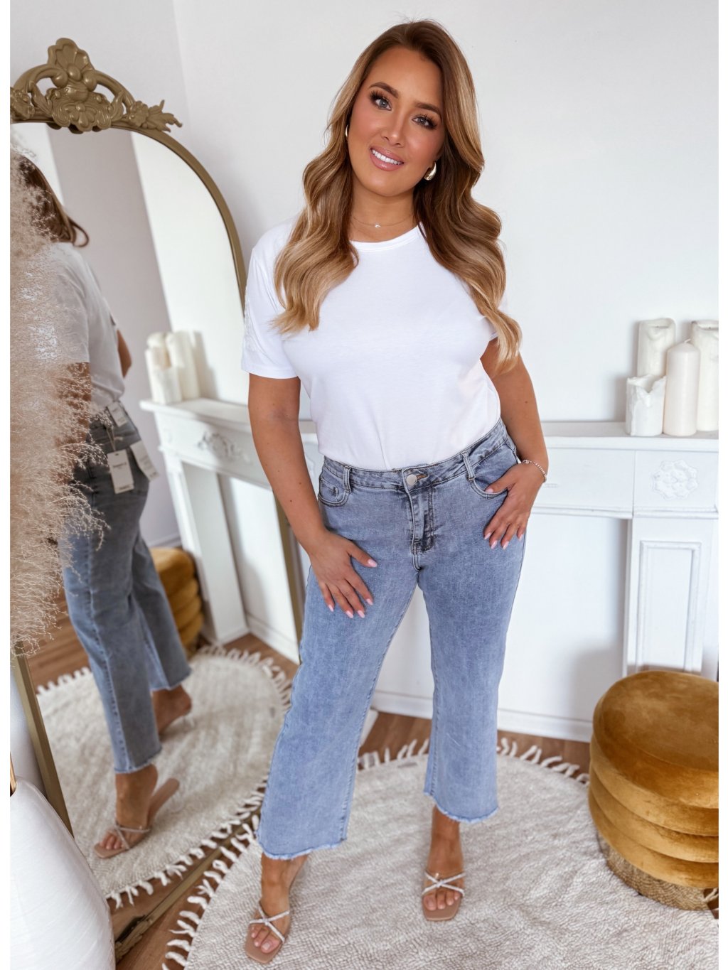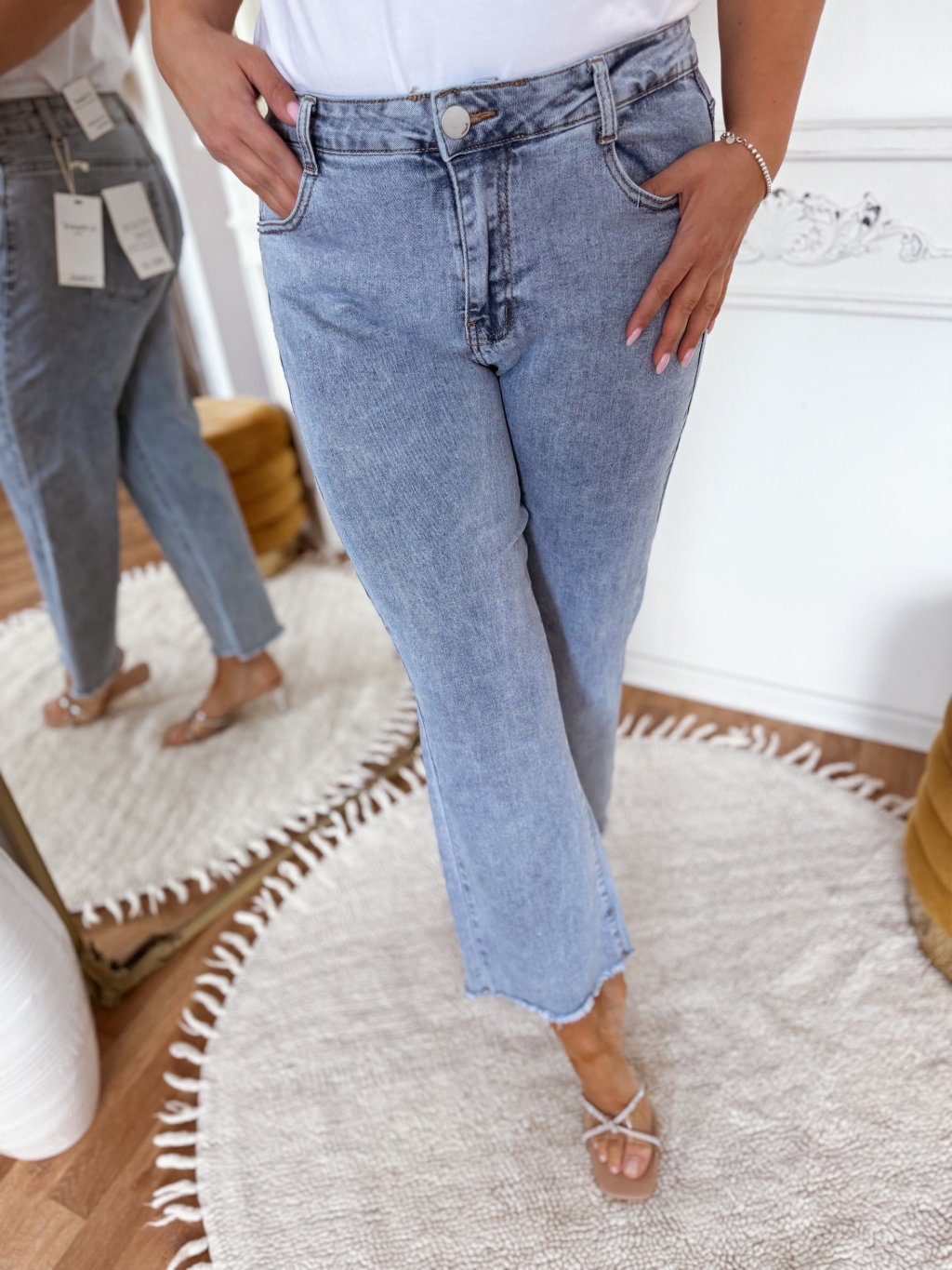 Elasztikus farmer, zsebekkel és magas derékkal. A nadrág alkalmazkodik az alakhoz. A modell 168 cm magas és 42-es méretet visel.