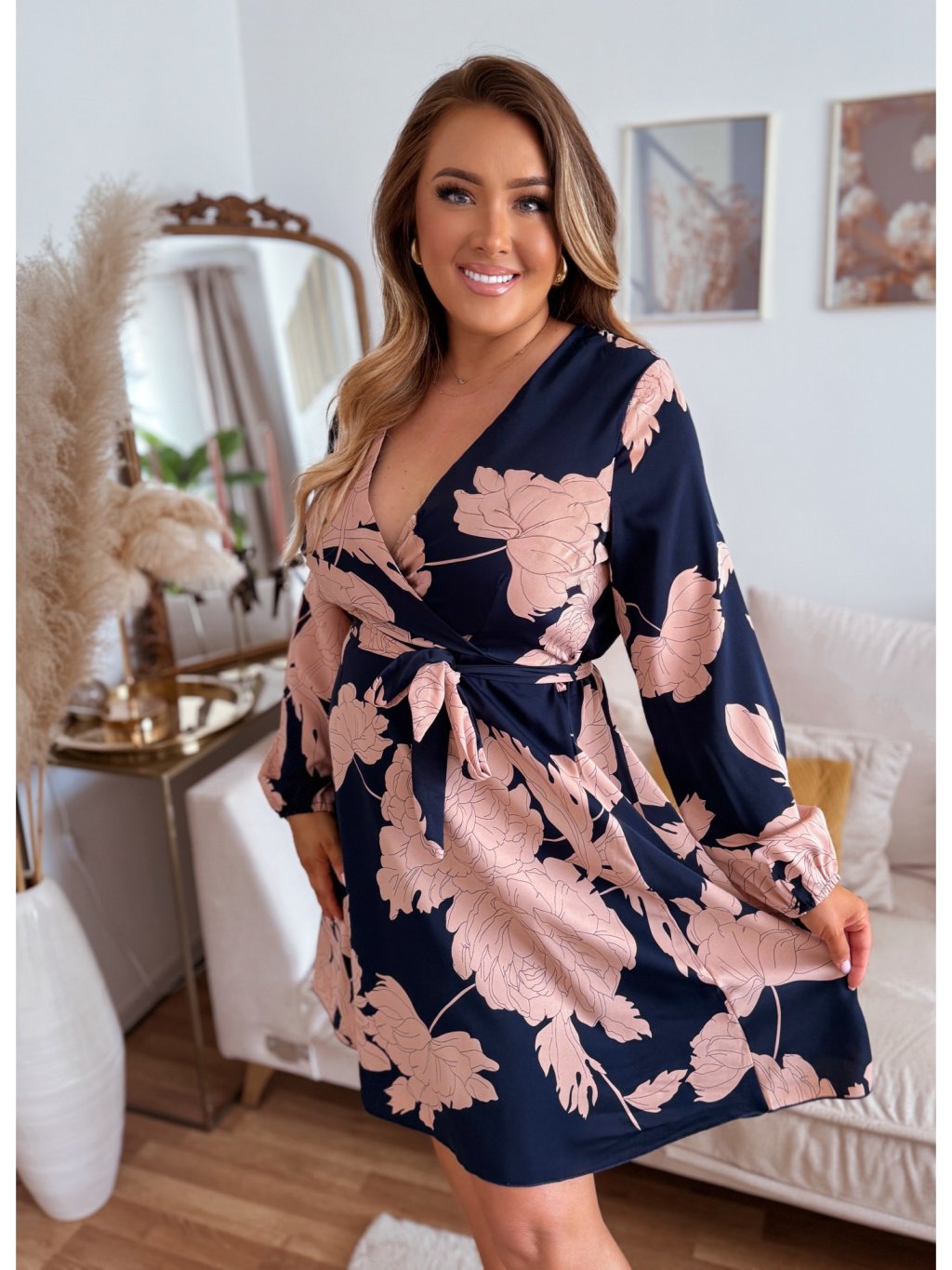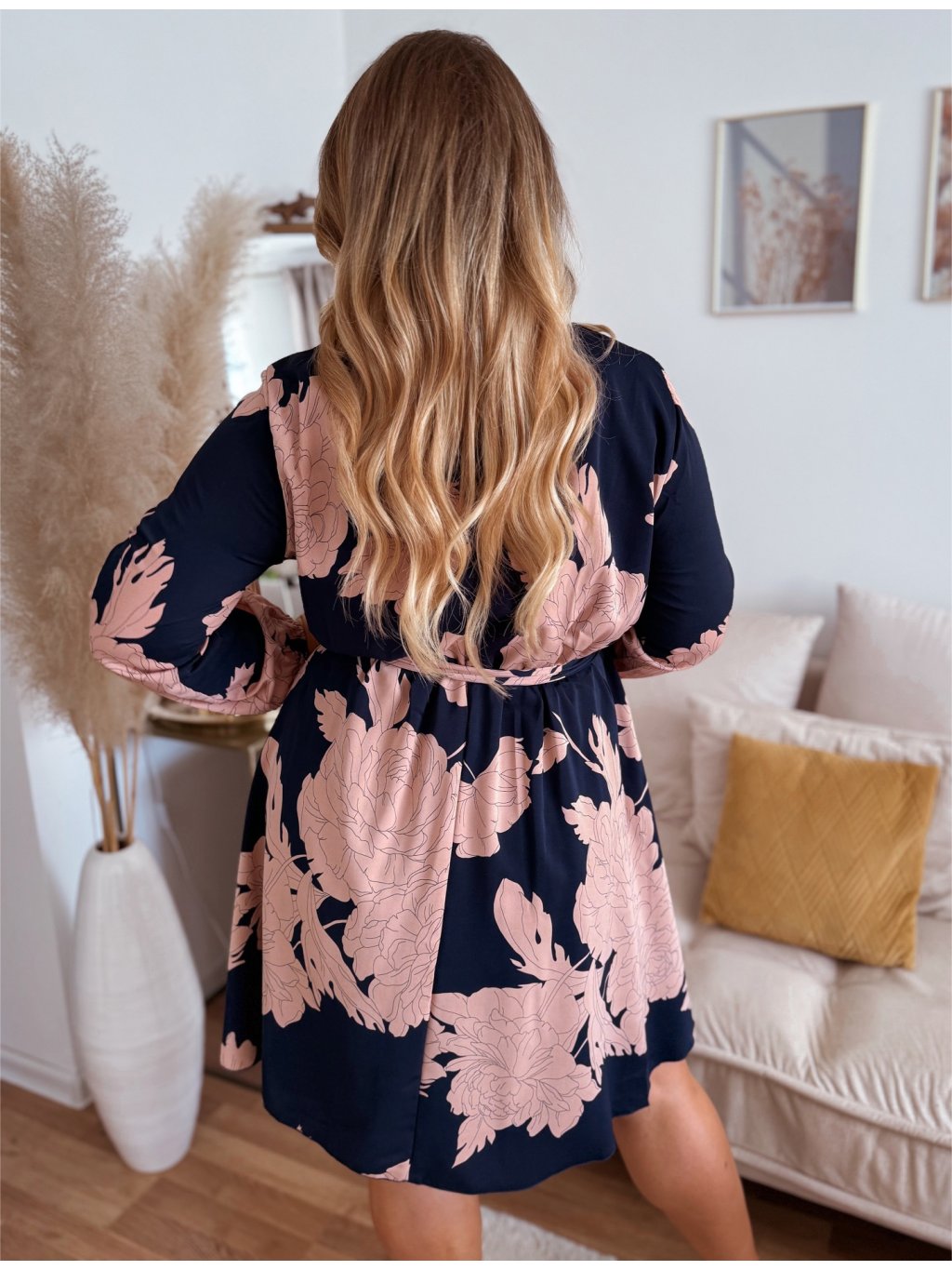 Rövid női ruha gumival a derékban és V-kivágással. A modell 168 cm magas és XL/XXL méretet visel.