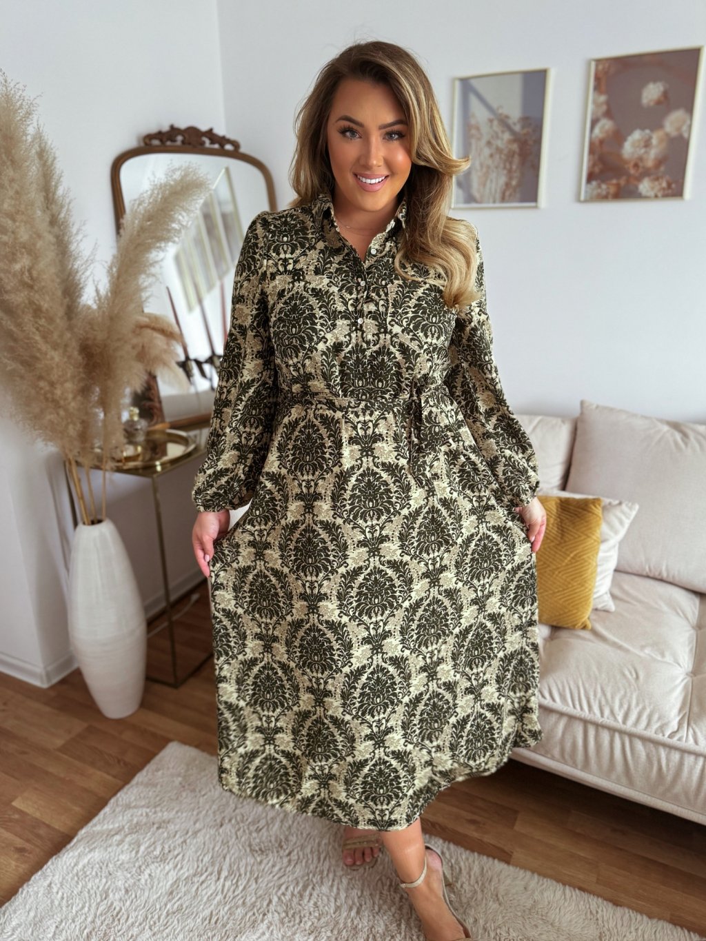 Hosszú női ruha, elöl gombos, hosszú ujjú. Ez a ruha nem rendelkezik gumival a derékban, övvel húzható össze. A ruha nem rugalmas. A modell 168 cm magas és XL/XXL méretet visel.