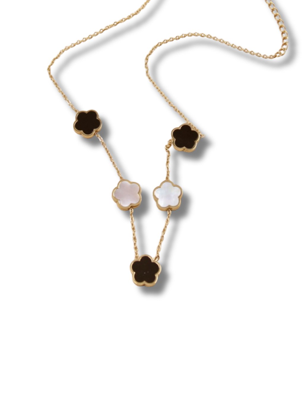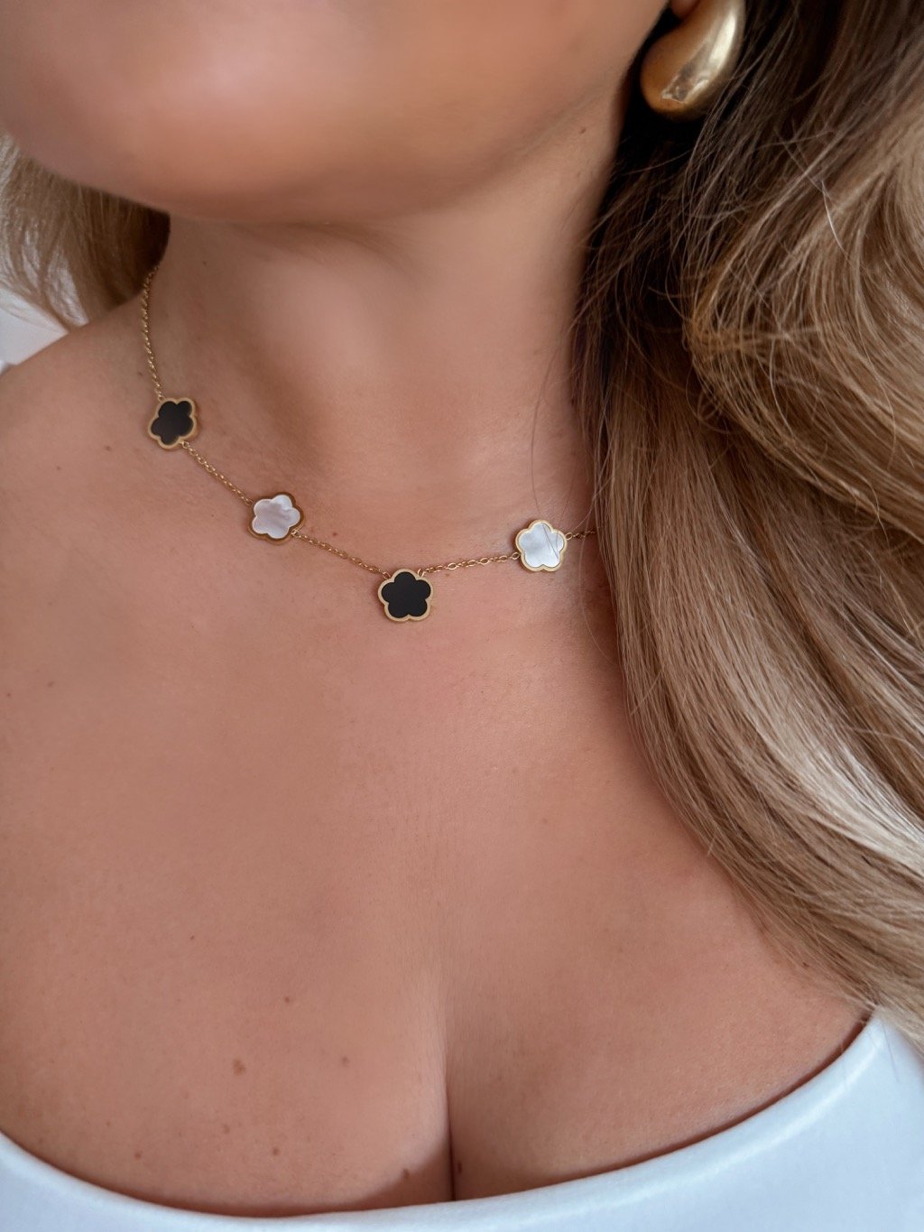 Női sebészeti acél nyaklánc fekete-fehér virágokkal, finom és elegáns megjelenésű. Időtlen dizájnjának köszönhetően mindennapi viseletre, mind különleges alkalmakra alkalmas, és gyönyörűen kiegészít bármilyen ruhát.