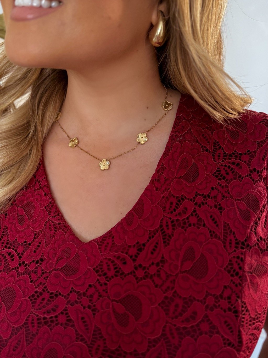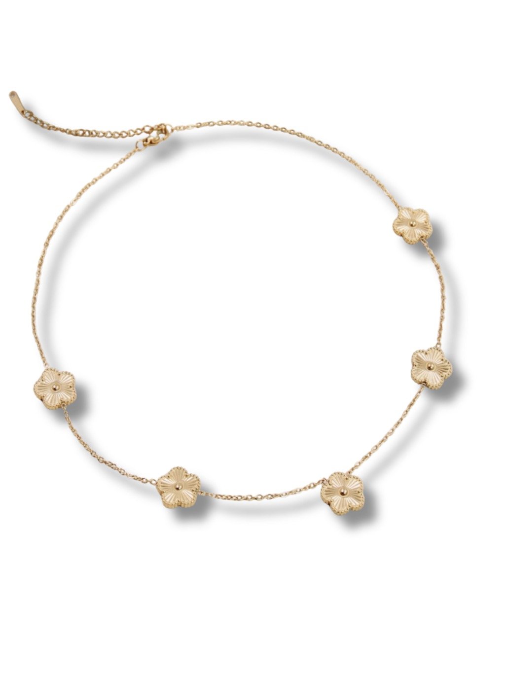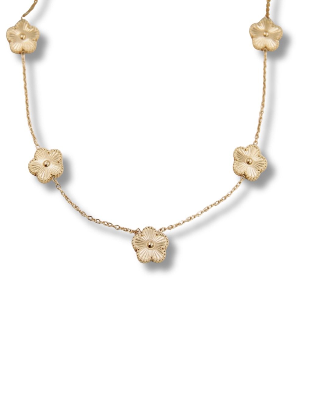 Arany színű, virágos részletekkel díszített nyaklánc. Finom kialakításának köszönhetően ideális mindennapi viseletre és különleges alkalmakra is, időtlen eleganciájával pedig minden öltözetet kiegészít.