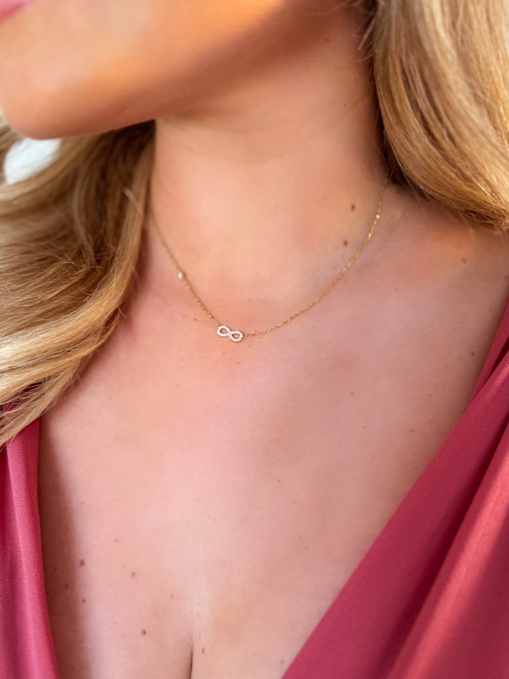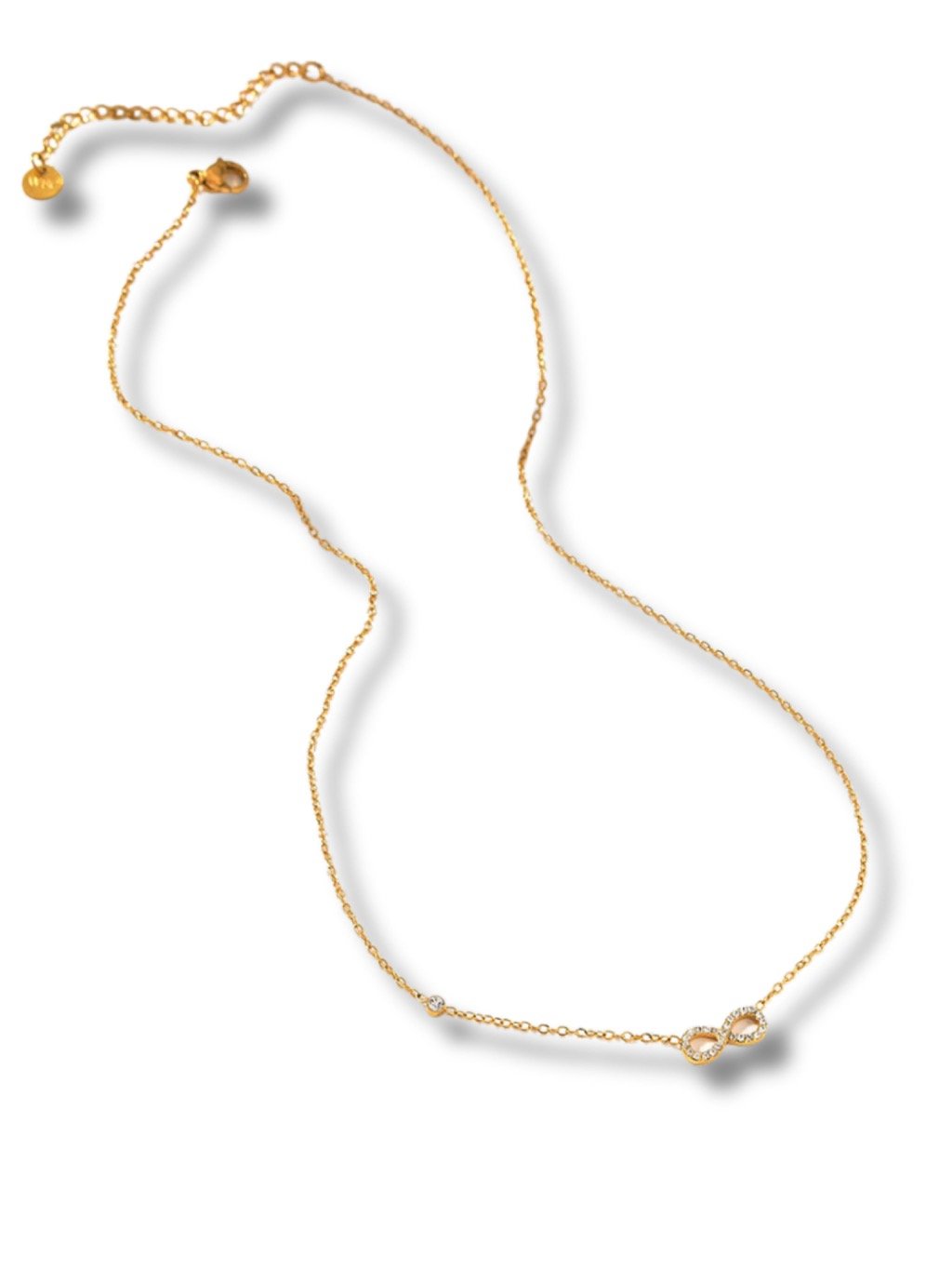 Finom, cirkónokkal díszített végtelen szimbólummal ellátott nyaklánc egy elegáns ékszer, mély szimbolikával. Az örökkévalóságot, a szerelmet és az erős köteléket képviseli, így ideális ajándék egy közeli személy számára, valamint stílusos kiegészítő a mindennapokra.