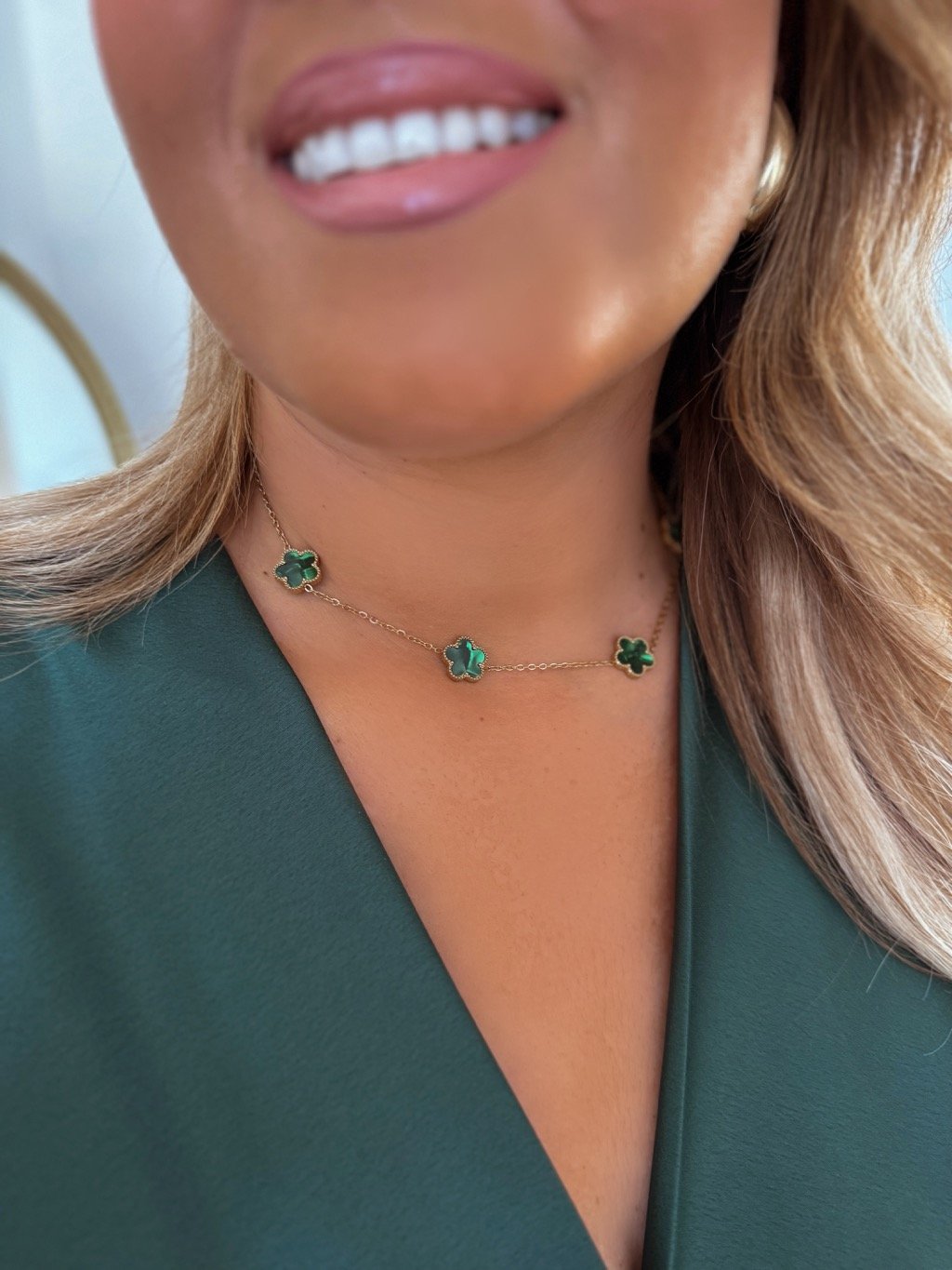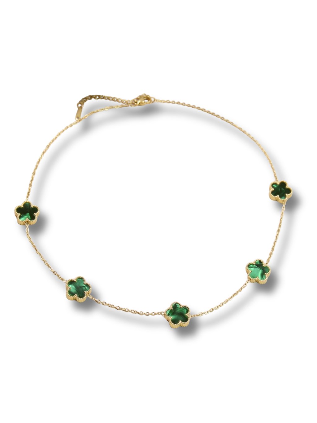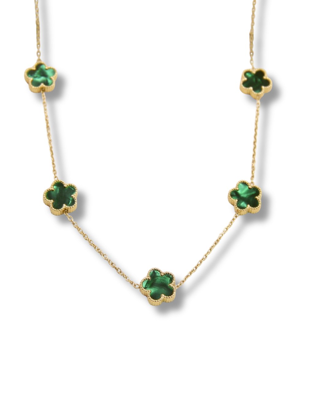 A zöld virágokkal díszített, sebészeti acélból készült női nyaklánc finom és elegáns megjelenést kölcsönöz. Időtlen dizájnjának köszönhetően mindennapi viseletre, mind különleges alkalmakra alkalmas, és gyönyörűen kiegészít bármilyen ruhát.