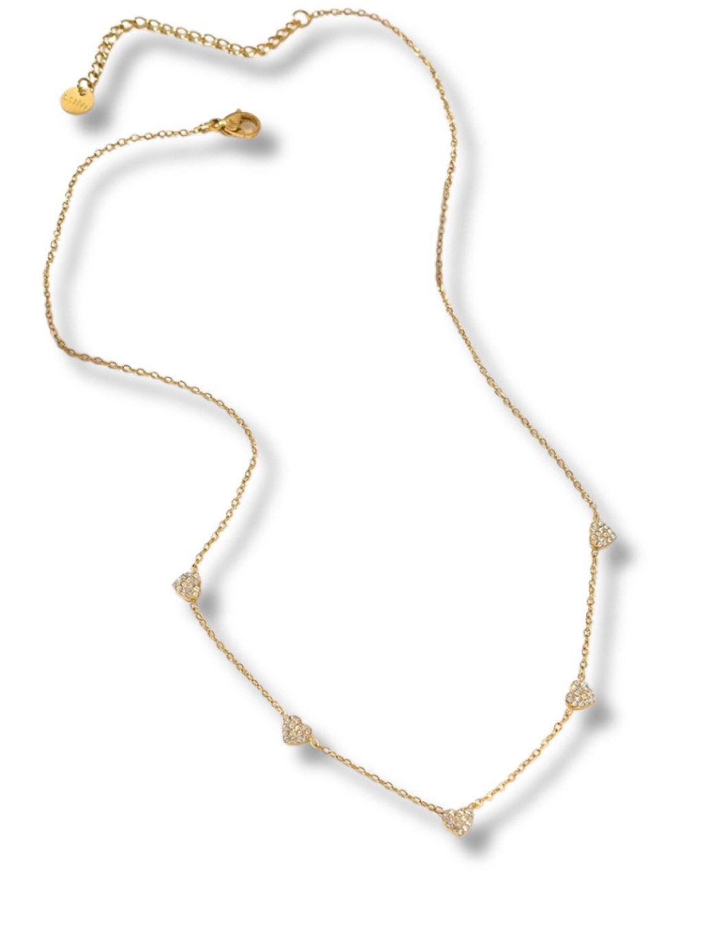 A cirkónkövekkel díszített, több szívvel készült, arany színű nyaklánc finom és romantikus megjelenést kölcsönöz. Finom kialakításának köszönhetően mindennapi viseletre, mind különleges alkalmakra alkalmas, és ideális szerelmi ajándék egy különleges személy számára.