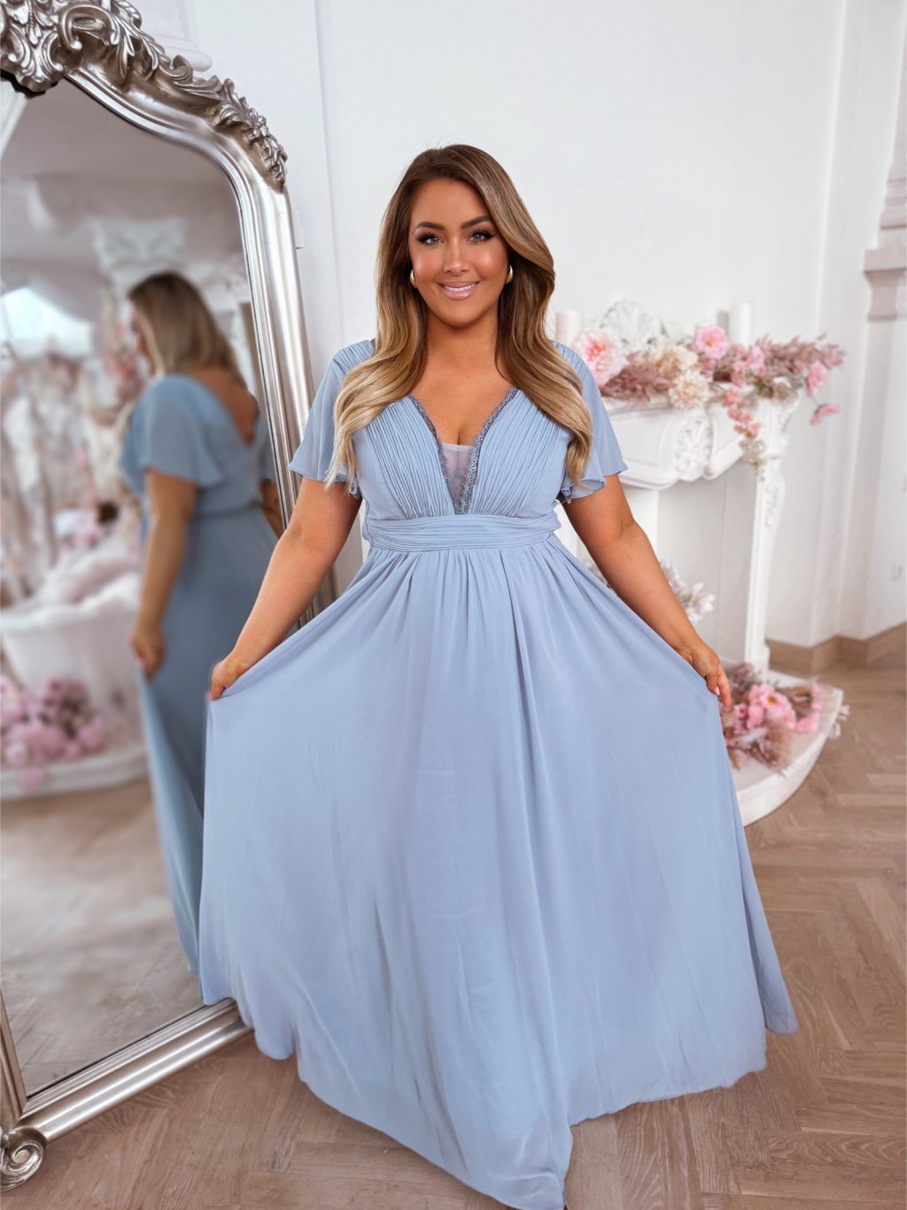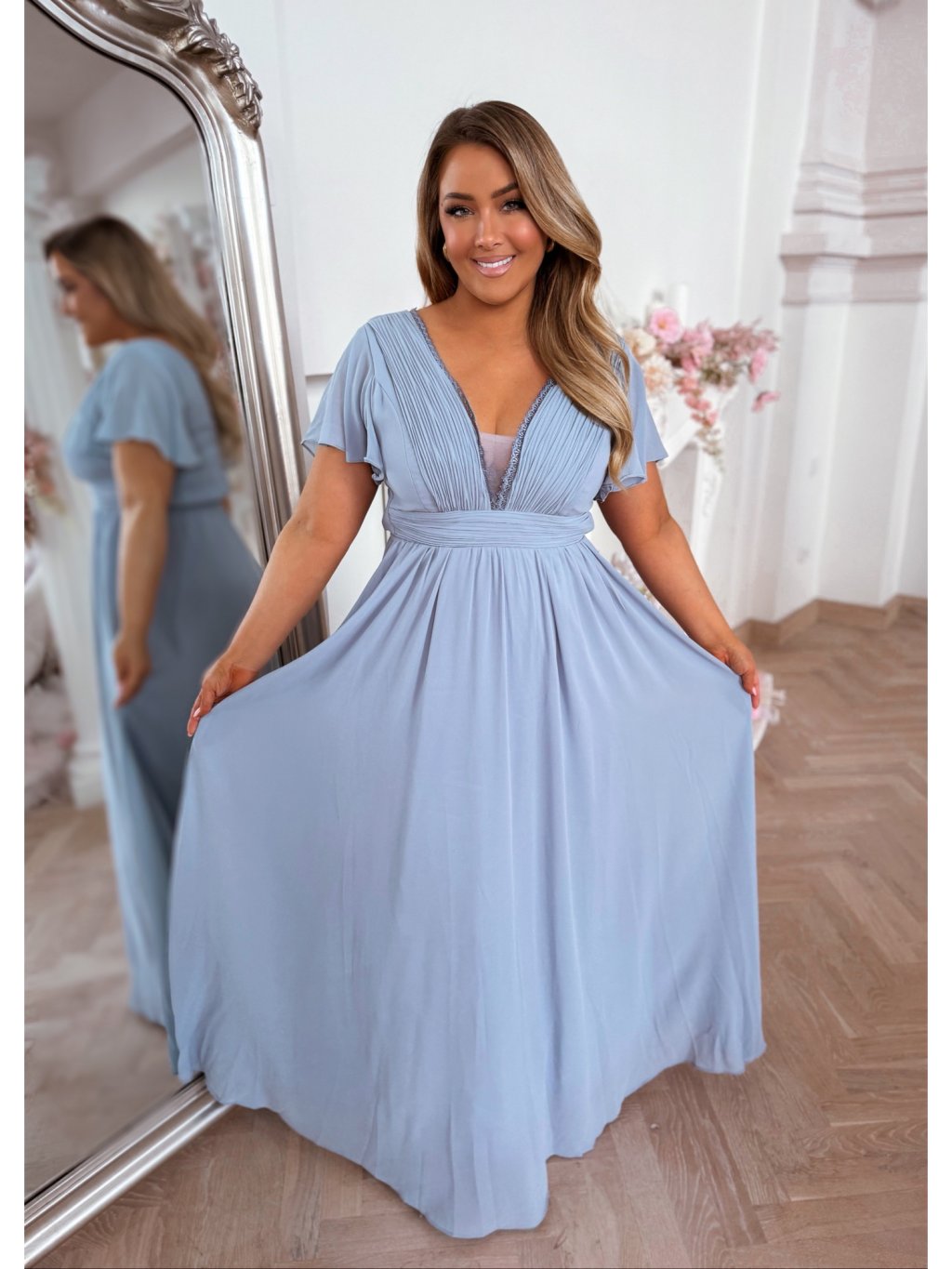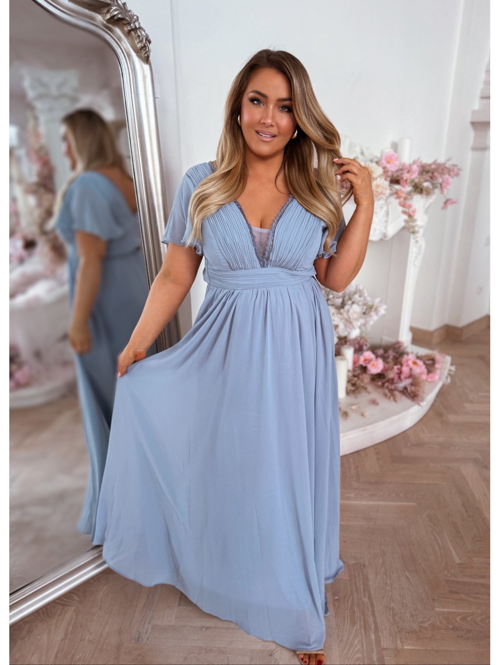 A hosszú, alkalmi ruha rövid ujjal, gumis derékkal és bő szoknyával rendelkezik. A modell 168 cm magas és XL (42) méretet visel.