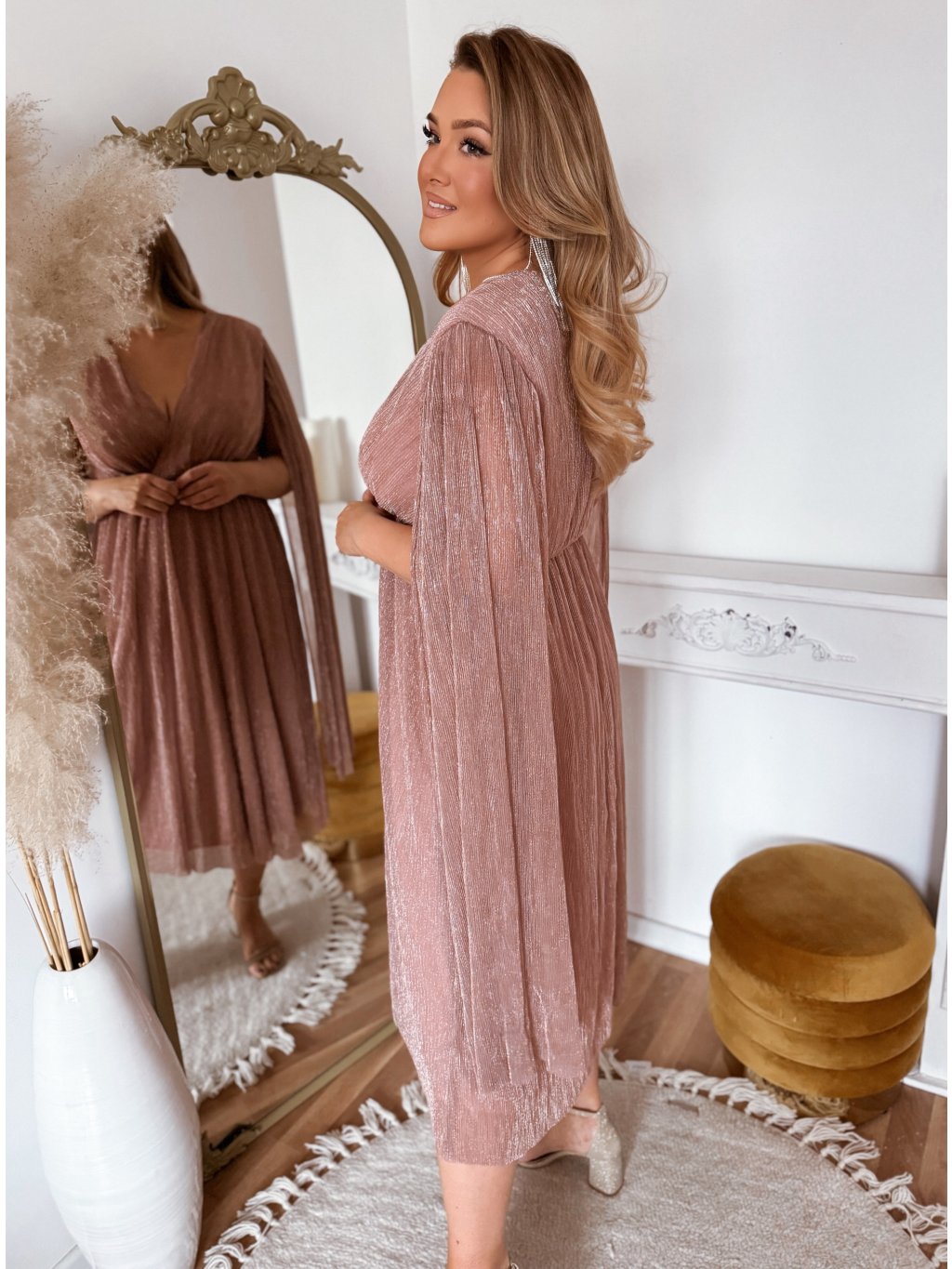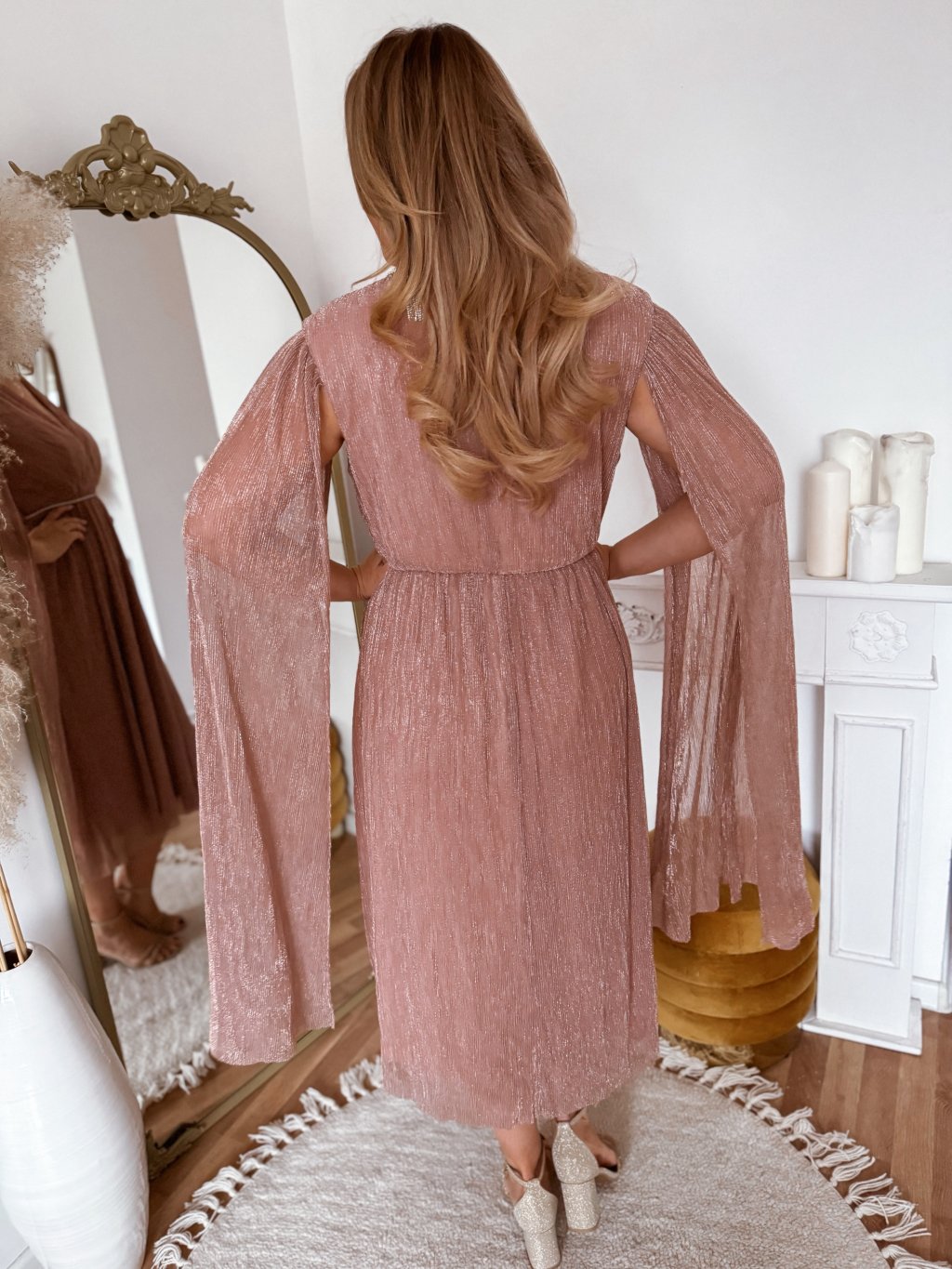 Közösségi ruha drámai ujjal és varrott díszövvel, antik rózsaszín színben. A ruha lazább szabású és gumírozott derékrésszel rendelkezik. A modell 168 cm magas és XL (42) méretet visel.