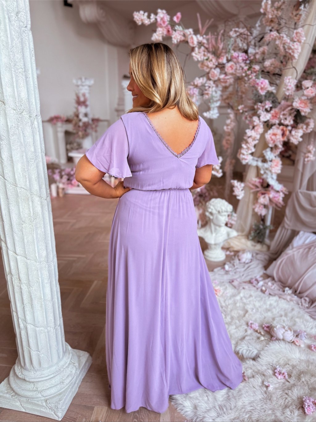 A hosszú, alkalmi ruha rövid ujjal, gumis derékkal és bő szoknyával rendelkezik. A modell 168 cm magas és XL (42) méretet visel.
