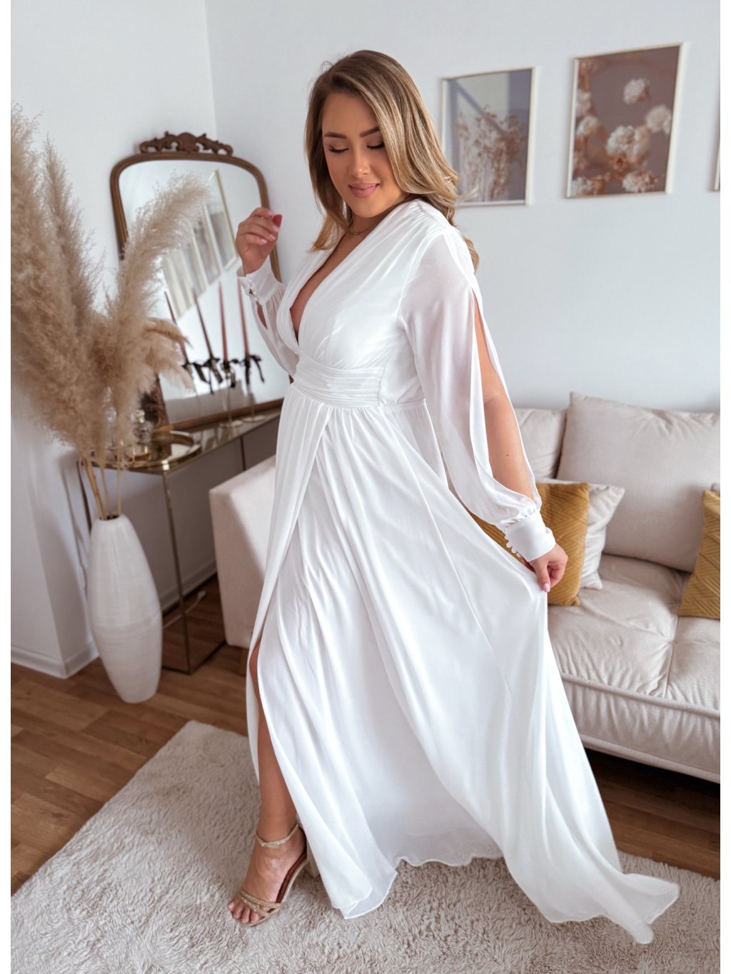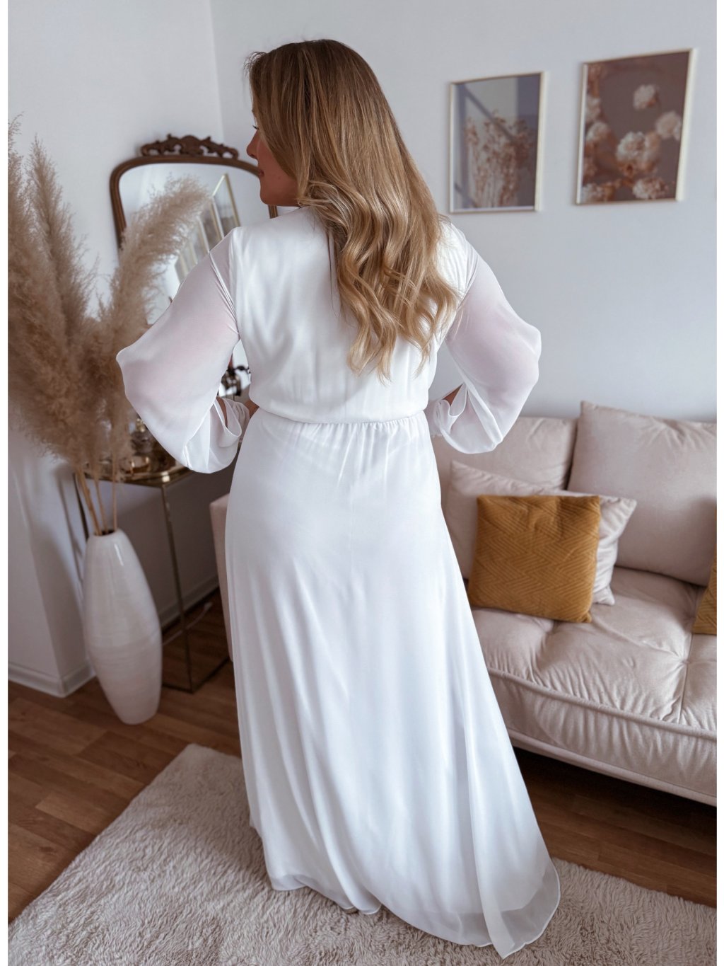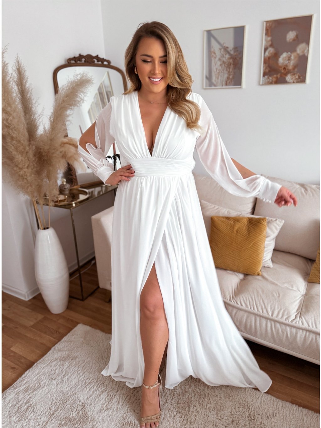 Hosszú, fehér alkalmi ruha, nagyon mély kivágással, feltűnő sliccel és hosszú ujjakkal. A moletteknek szánt alkalmi ruha hátul bevarrt gumírozással rendelkezik a derékrészen. A szoknya teljesen bő. A szoknya teljesen bő. A modell 168 cm magas és XL (42) méretet visel.