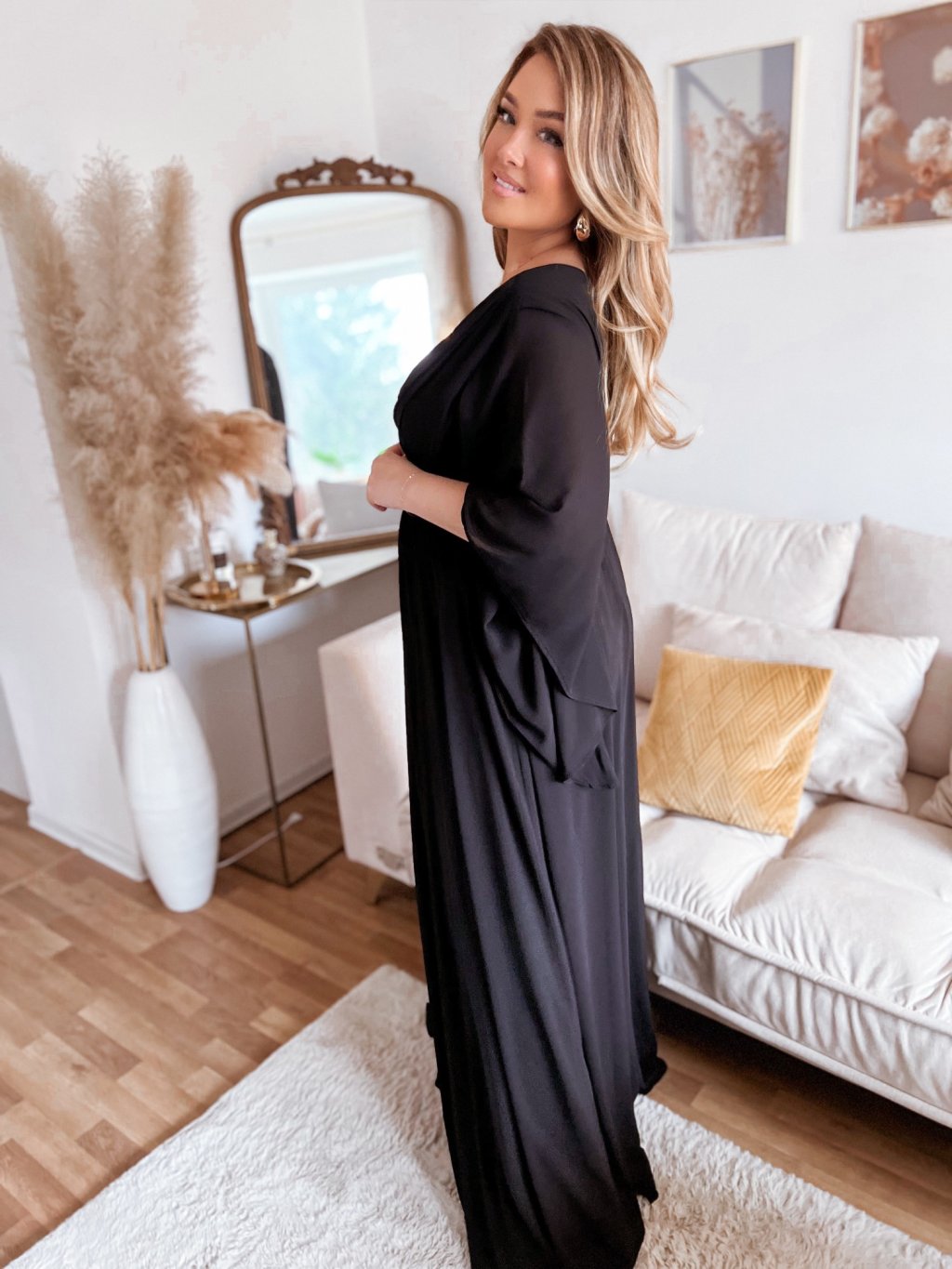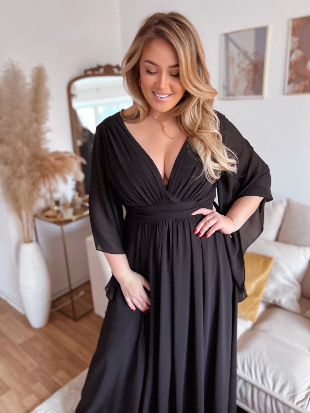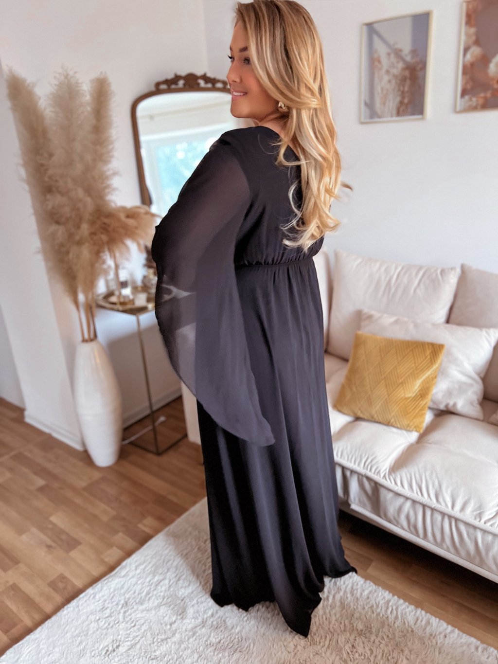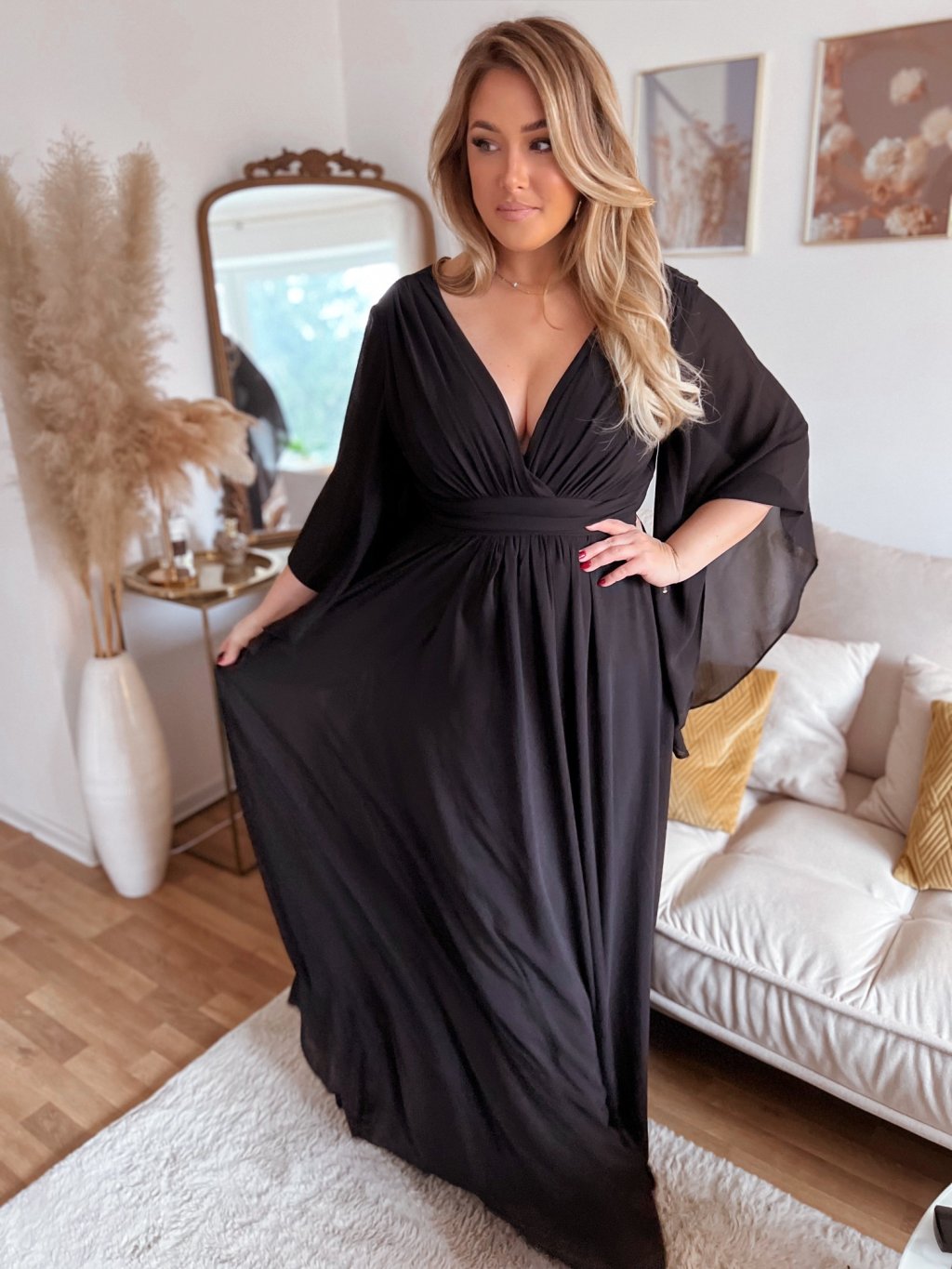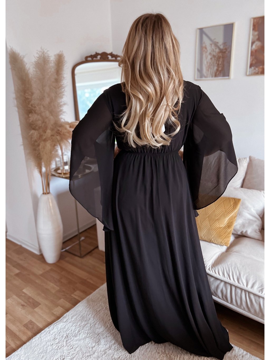 Hosszú, mély dekoltázzsal és drámai ujjakkal ellátott alkalmi ruha. A moletteknek szánt alkalmi ruha hátul bevarrt gumírozással rendelkezik a derékrészen. A szoknya teljesen bő. A szoknya teljesen bő. A modell 168 cm magas és XL (42) méretet visel.