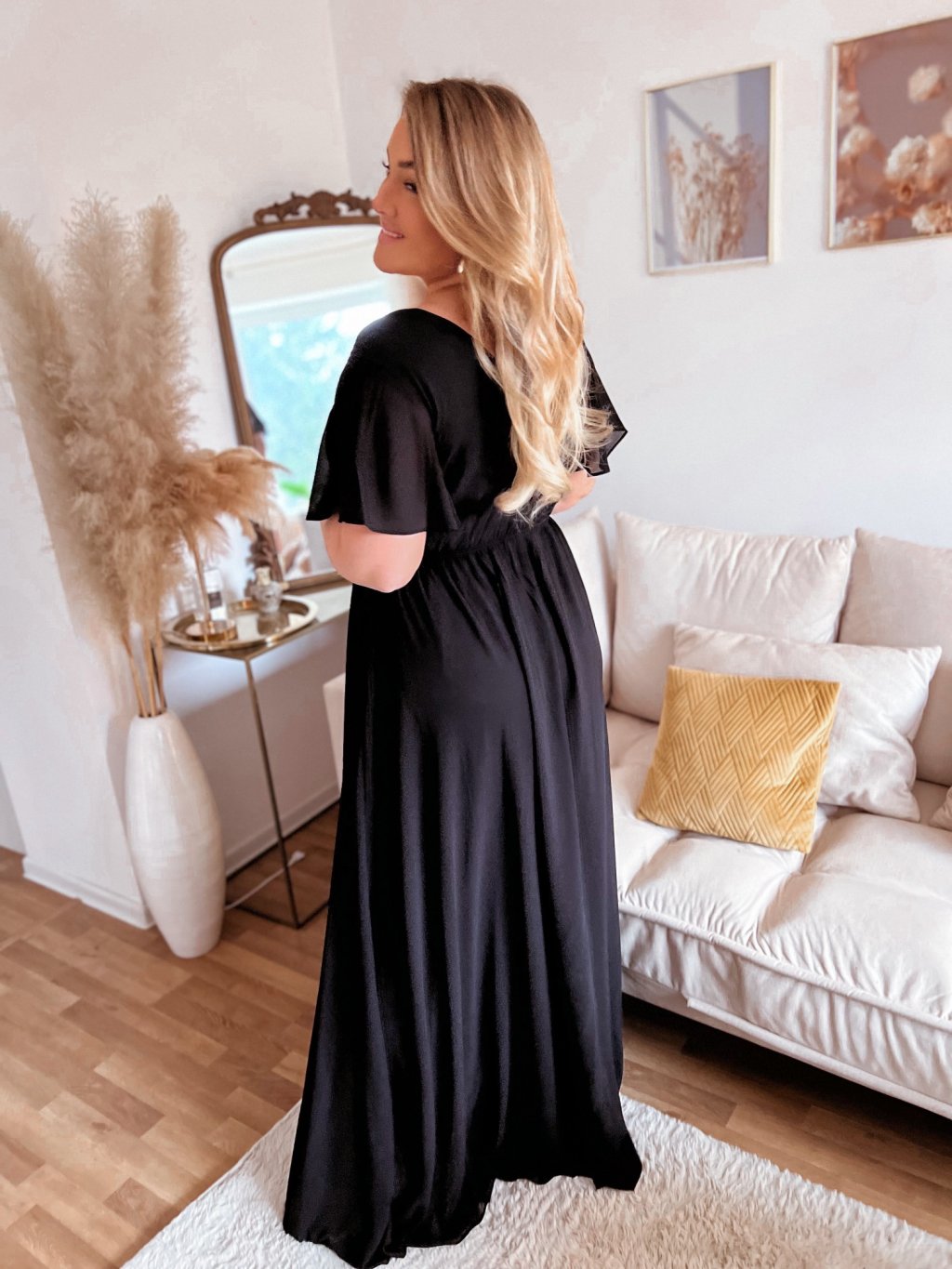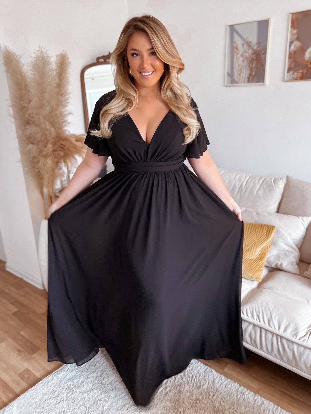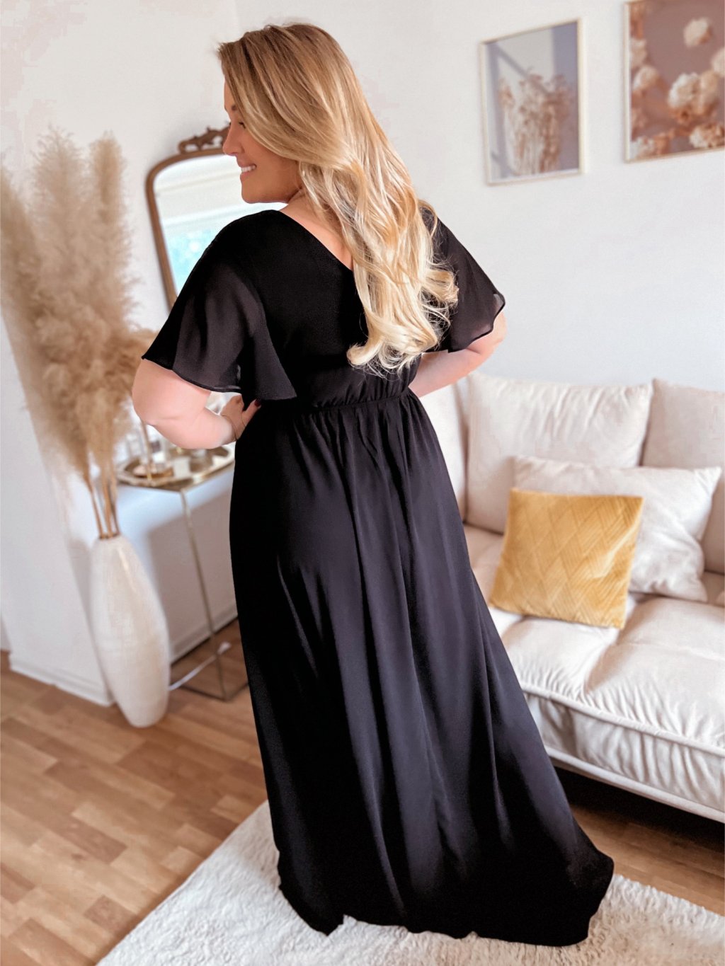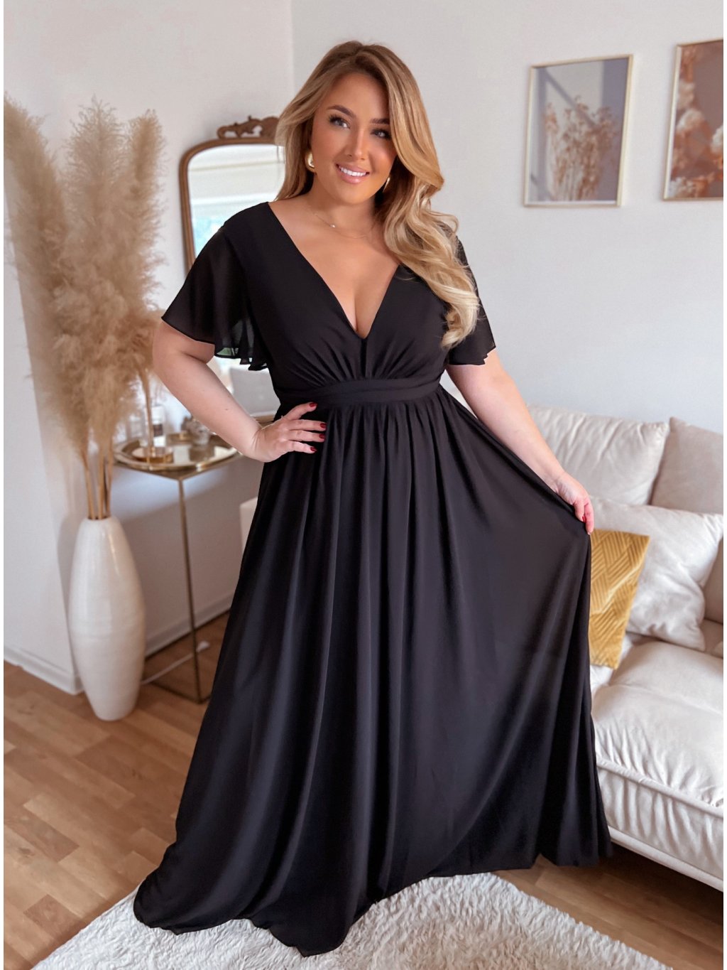 Hosszú, fekete színű, rövid ujjú alkalmi ruha moletteknek, elasztikus derékpánttal és bő szoknyával. A modell 168 cm magas és XL (42) méretet visel.