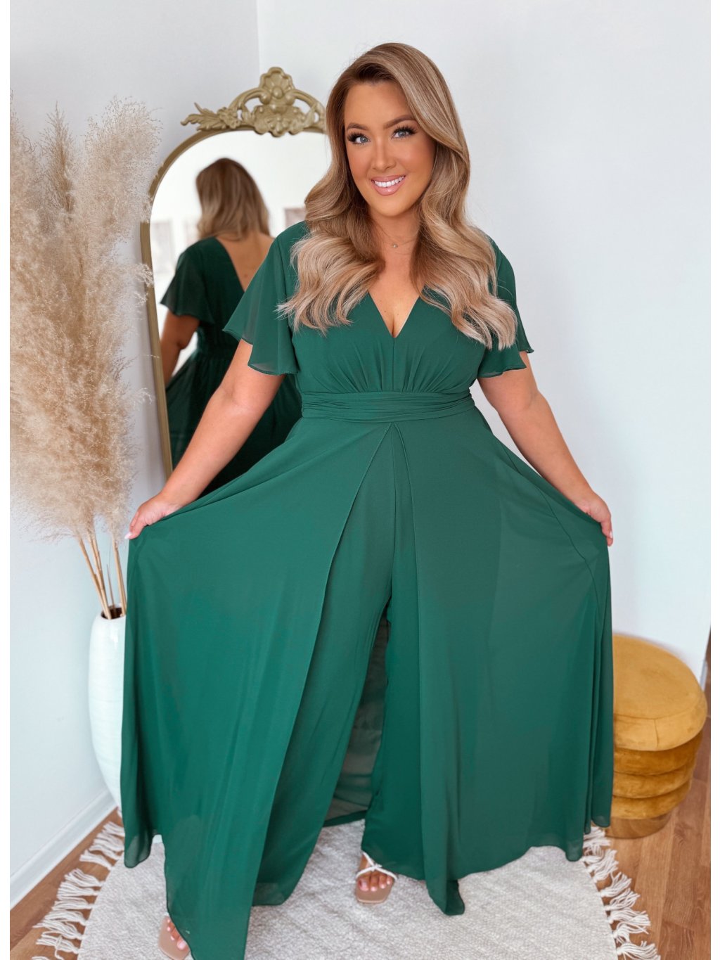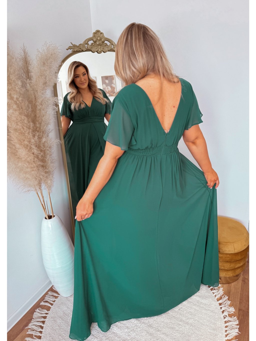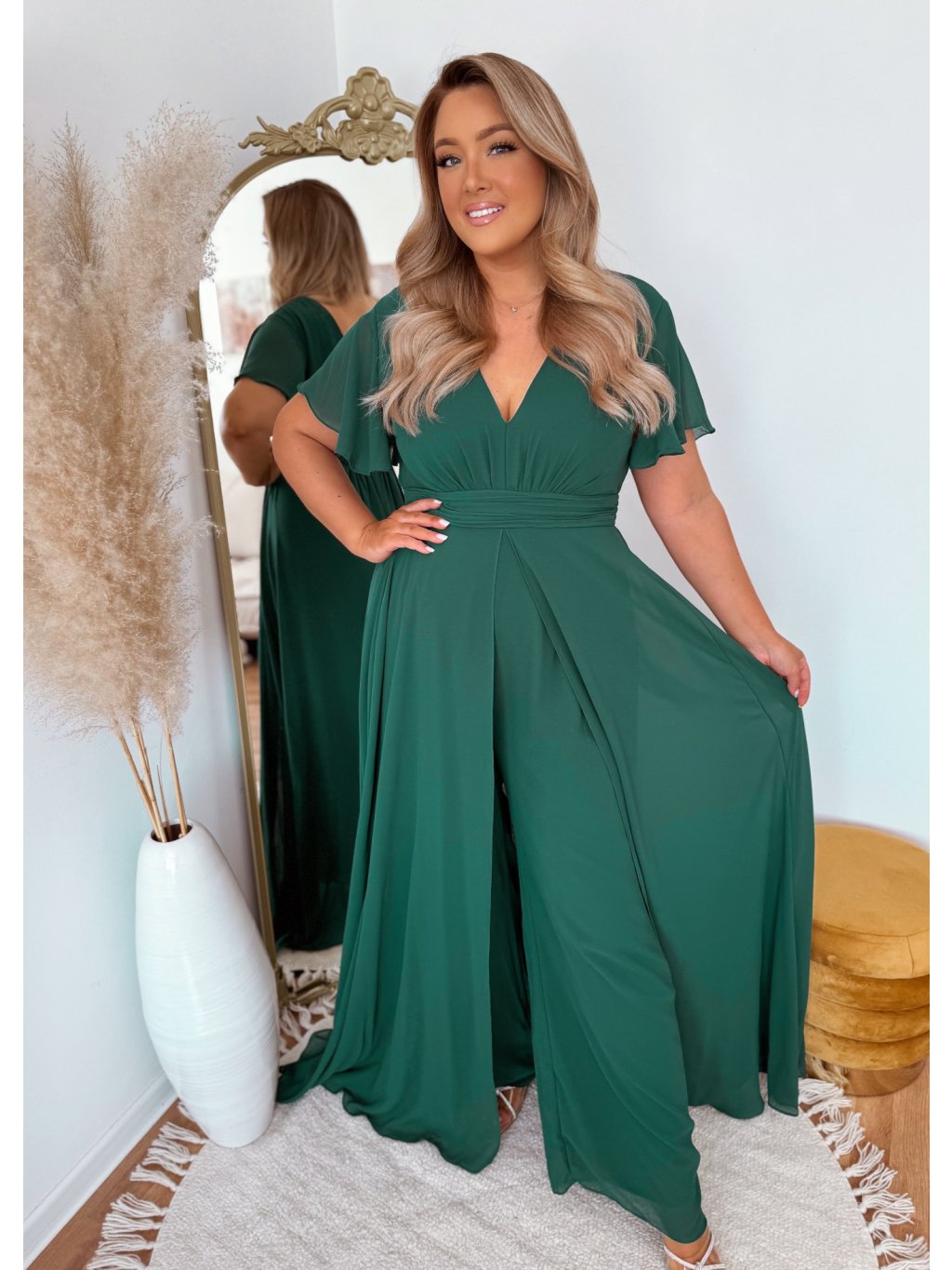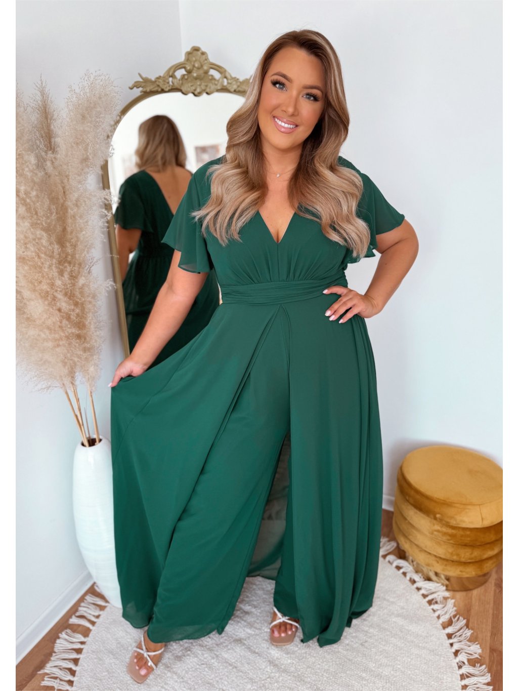 Ez az elegáns overál hátul cipzárral és derékban gumival rendelkezik. Hátulról úgy néz ki, mint egy klasszikus ruha, a szoknya szépen lengve járás közben. A modell 168 cm magas és XL (42) méretet visel.