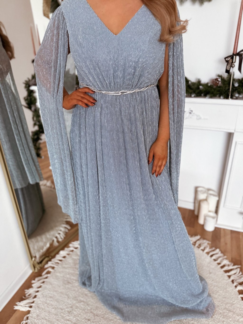 Elegáns ruha drámai ujjal és ezüst színű, rávarrott díszövvel. A ruha lazább szabású és gumírozott derékrésszel rendelkezik. A modell 168 cm magas és XL (42) méretet visel.