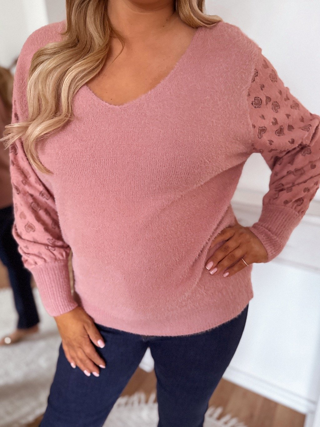 Rózsaszín pulóver szív alakú ujjal