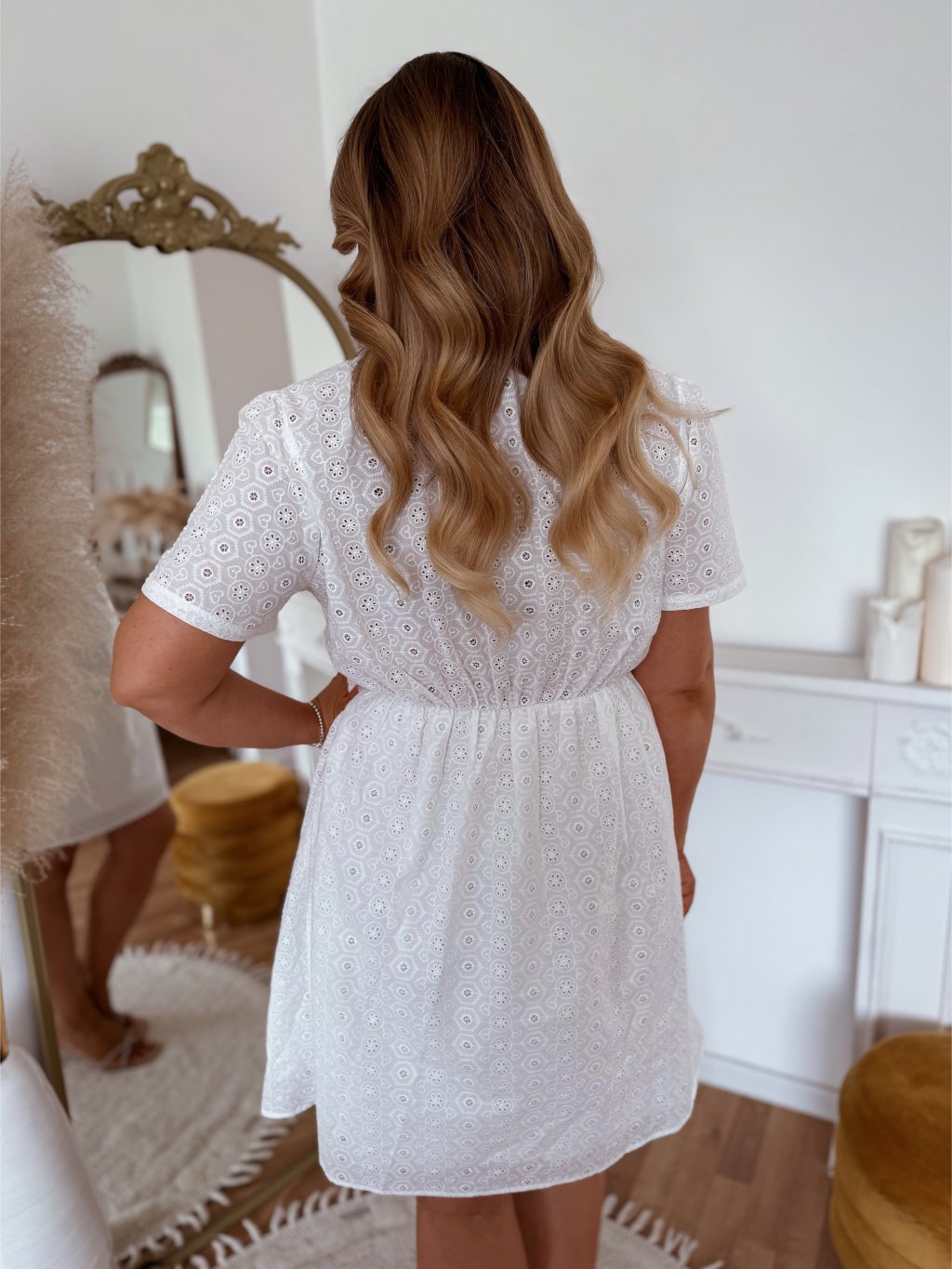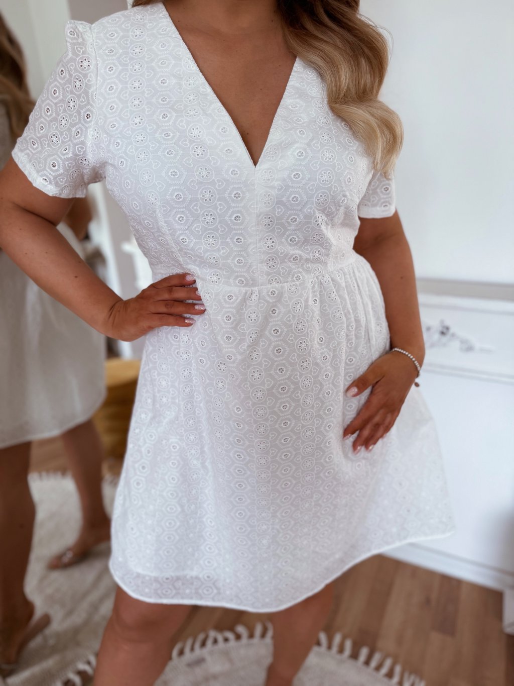 Angol hímzéses A-vonalú, térd feletti, rövid ujjú ruha, gumírozott derékkal, enyhén rugalmas. A model mér 168 cm, és XL-es méretet visel.