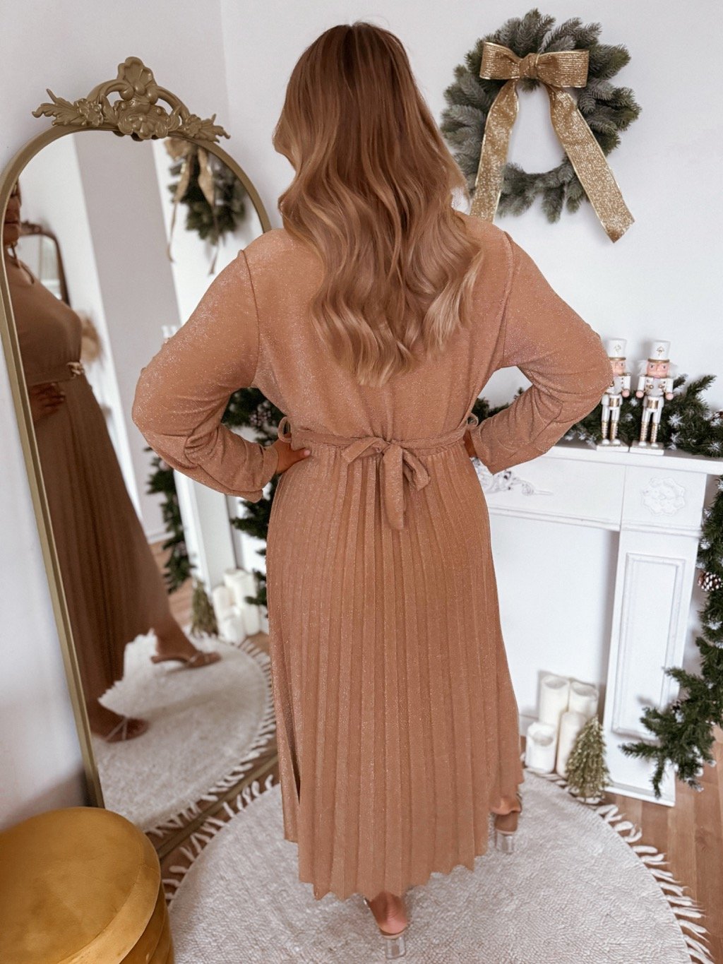 Az elegáns ruha csillogó anyagból készült, övvel és gumírozott derékkal rendelkezik. A ruha rugalmas. A pliszírozott szoknyájú ruha bő szabású. A modell 168 cm magas és L/XL méretet visel.