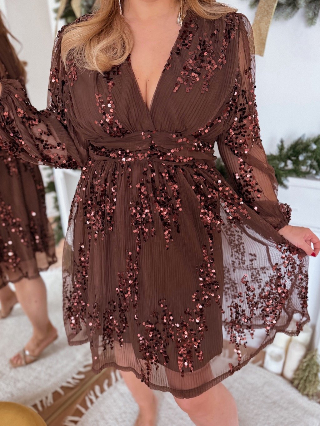 A rövid sötétbarna ruhák molett nőknek gumis derékrésszel rendelkeznek, a csípő rész szabadon szabott. A model mér 168 cm, és XL-es méretet visel.