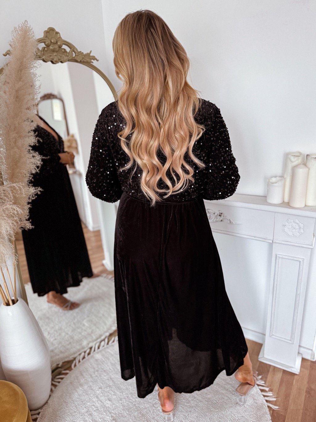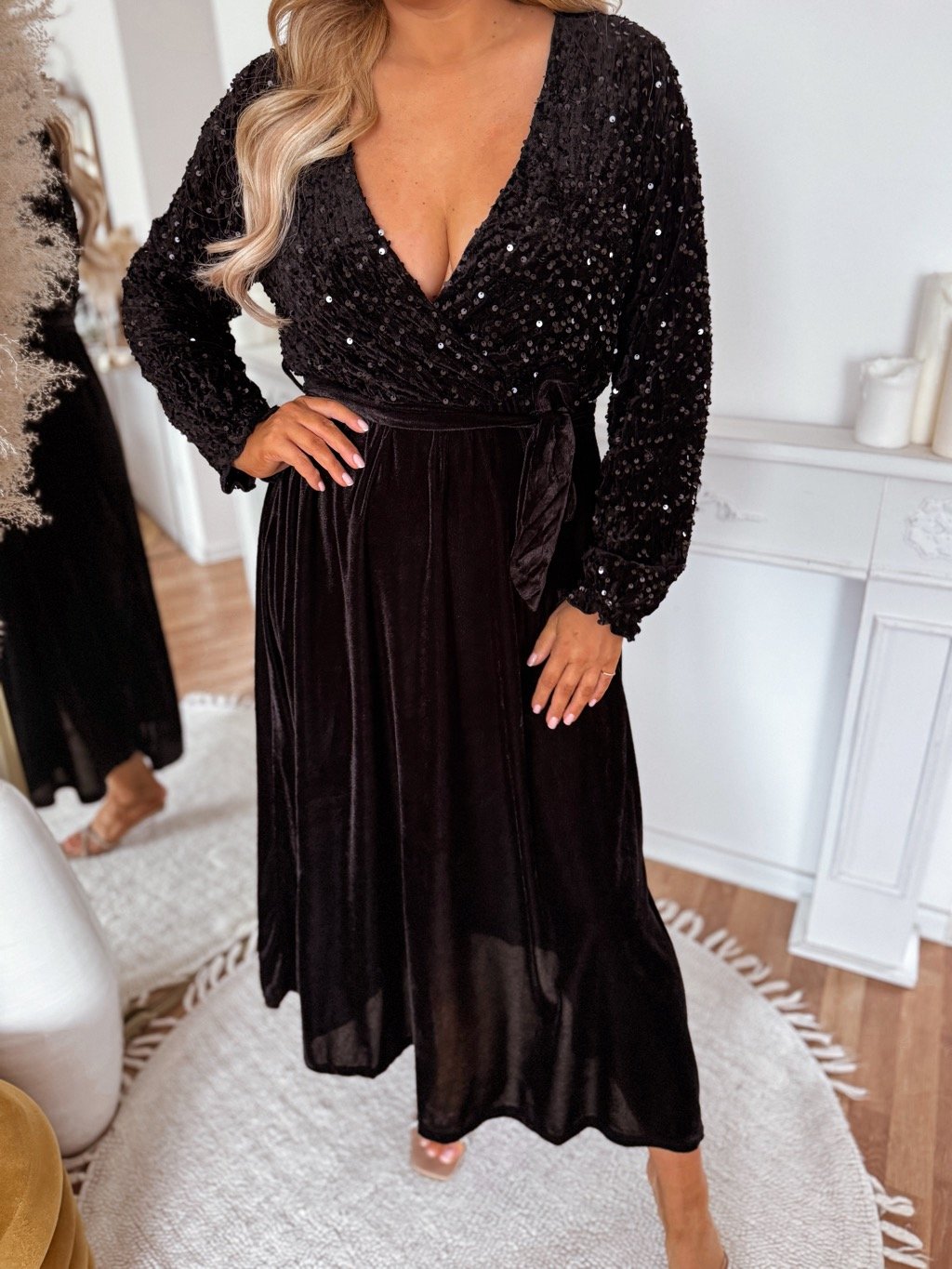 A hosszú, elegáns ruhának gumírozott a dereka és bő szoknyája van. A modell 168 cm magas és L/XL méretet visel.