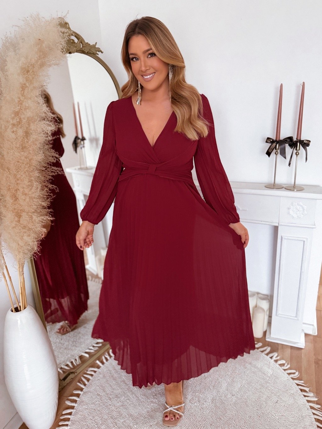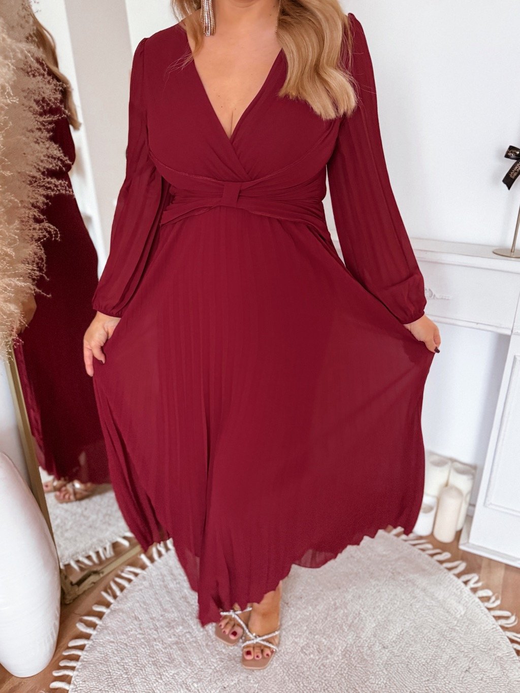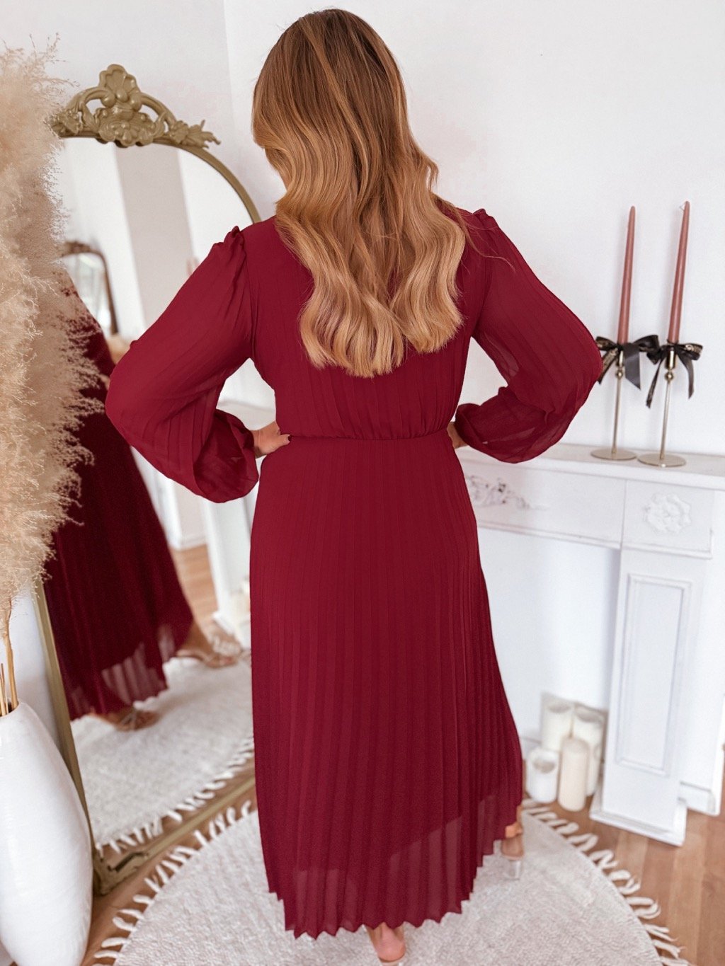 Az elegáns, hosszú ujjú, redőzött ruha mellrésznél szűkebb szabású, és a derékban gumírozott. A ruha csípő tájékán teljesen bő. A modell 168 cm magas és L/XL méretet visel.