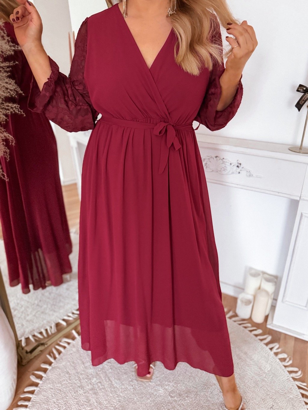 Hosszú, elegáns ruha átlátszó anyagból, ujjakon finom virágokkal díszítve. A ruha derekán gumírozás található, a szoknya bő szabású. A modell 168 cm magas és L/XL méretet visel.