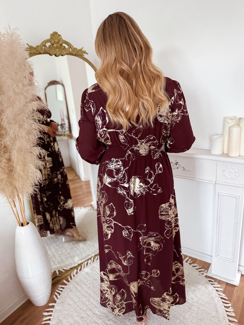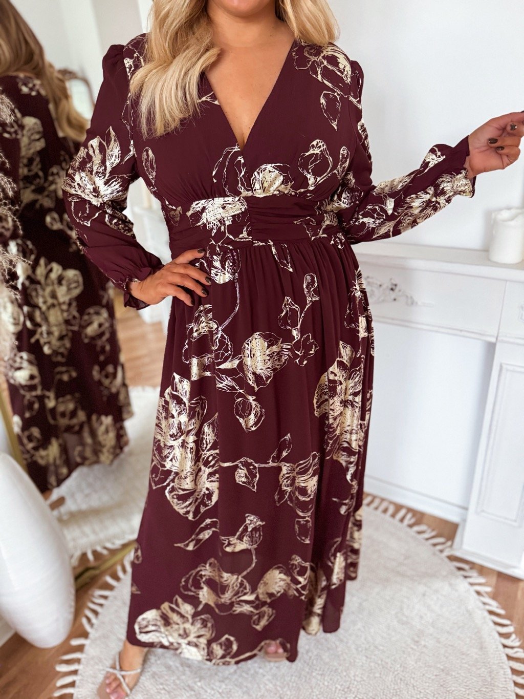 Ez az elegáns, bordó színű, arany virágmintás maxi ruha ideális választás társasági eseményekre, ünnepekre és romantikus vacsorákra. A mély V-kivágás és az összehúzott, gumis derékrész gyönyörűen formálja az alakot, míg a hosszú ujjak finom eleganciát kölcsönöznek a ruhának. A könnyű, esése anyag kellemes viseletet biztosít, nőies, bájos megjelenést kölcsönöz. A model mér 168 cm, és XL-es méretet visel.