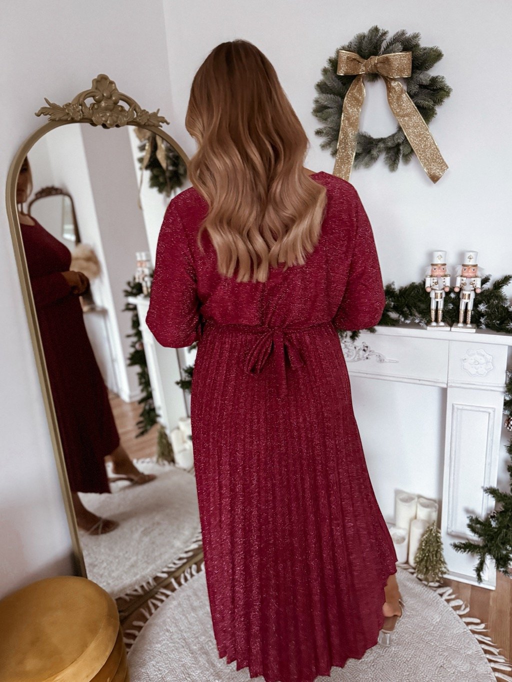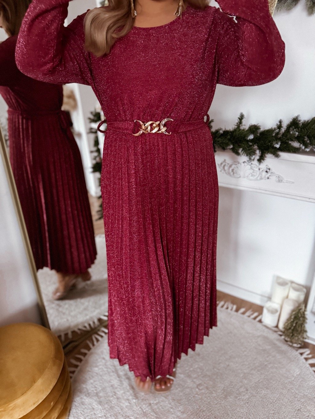 Az elegáns ruha csillogó anyagból készült, övvel és gumírozott derékkal rendelkezik. A ruha rugalmas. A pliszírozott szoknyájú ruha bő szabású. A modell 168 cm magas és L/XL méretet visel.