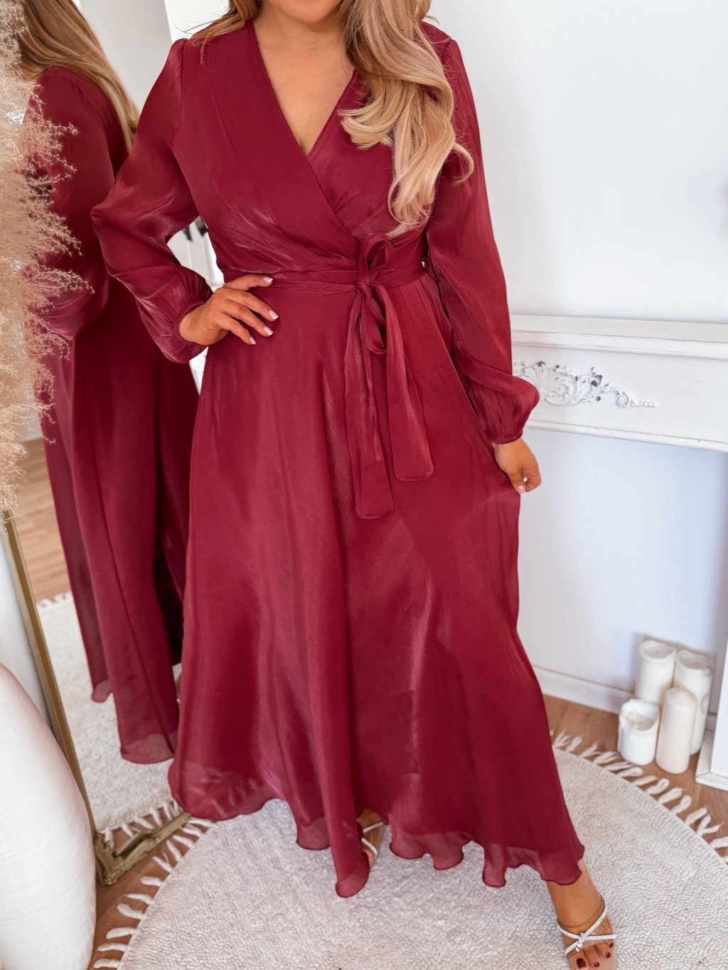 Társasági ruha, bő maxiszoknyával, övvel a derékban szűkítve. Az ujjak átlátszóak. Az ujjak átlátszóak. A modell 168 cm magas és XL (42) méretet visel.