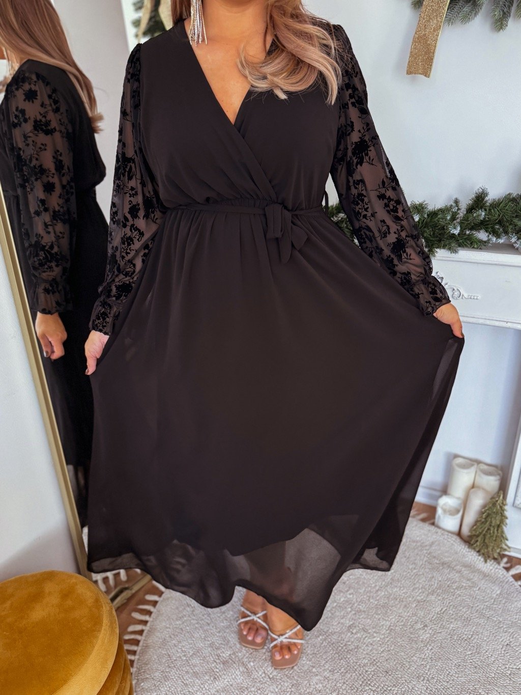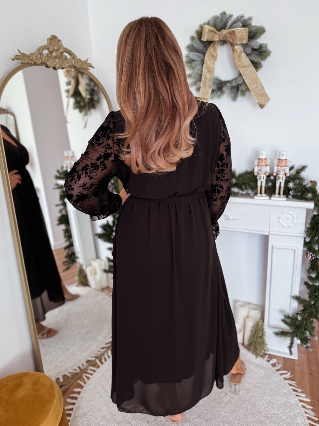 Hosszú, elegáns ruha átlátszó anyagból, ujjakon finom virágokkal díszítve. A ruha derekán gumírozás található, a szoknya bő szabású. A modell 168 cm magas és L/XL méretet visel.