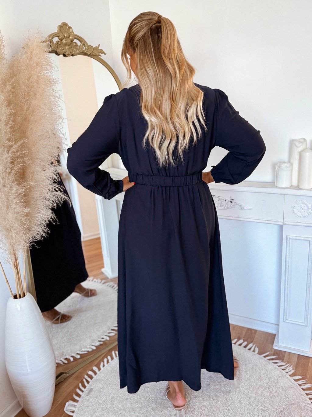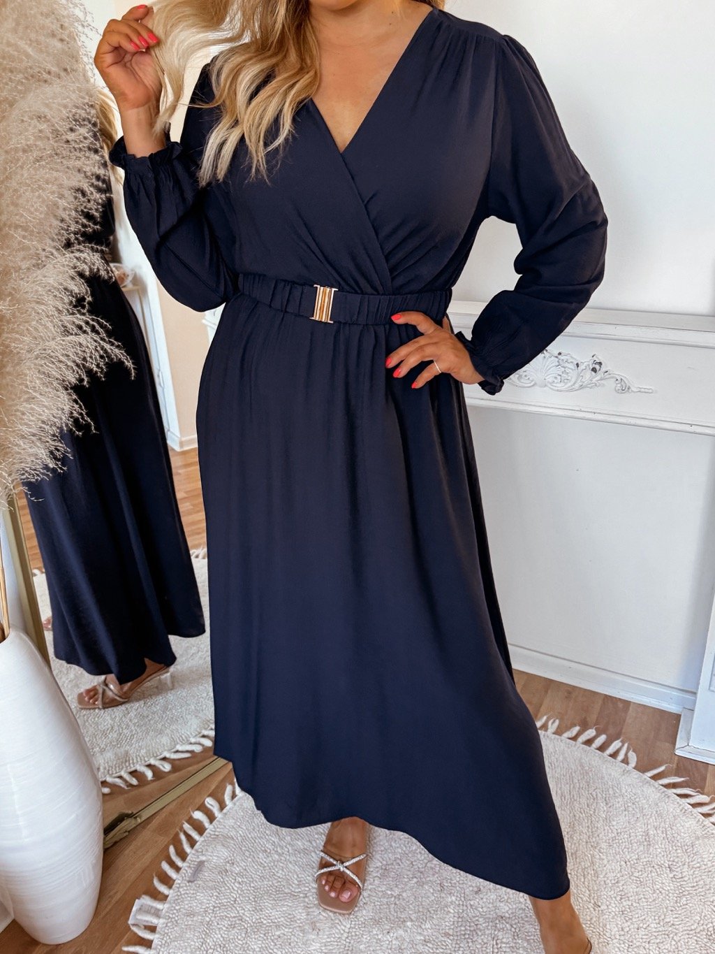 Ez az elegáns, hosszú ruha molett nőknek kényelmes, lazább szabású, hosszú, gumis ujjakkal és díszítő övvel rendelkezik, amely kiemeli a derekat. A derékrészbe gumírozás van bevarrva. A „V” kivágás optikailag hosszabbítja a nyakat és nagyon nőies megjelenést kölcsönöz. A model mér 168 cm, és XL-es méretet visel.