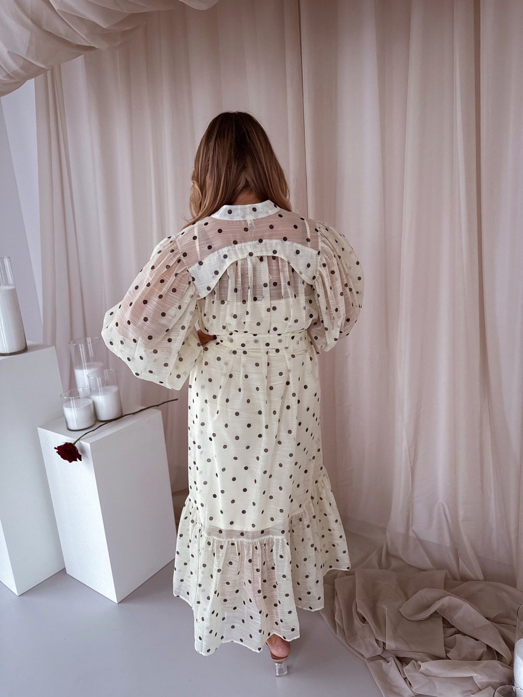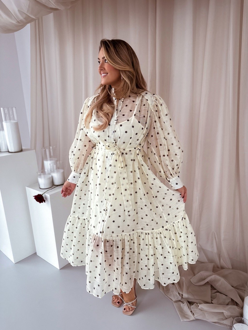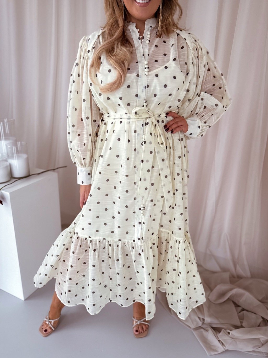 Elegáns krémszínű pöttyös maxiruha